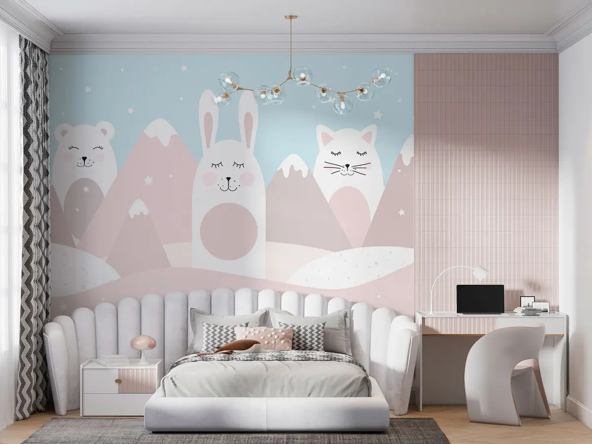 Fototapeter Kanin, bjørn og rev på bakgrunn av beige snødekte fjell. Nr. u98135
