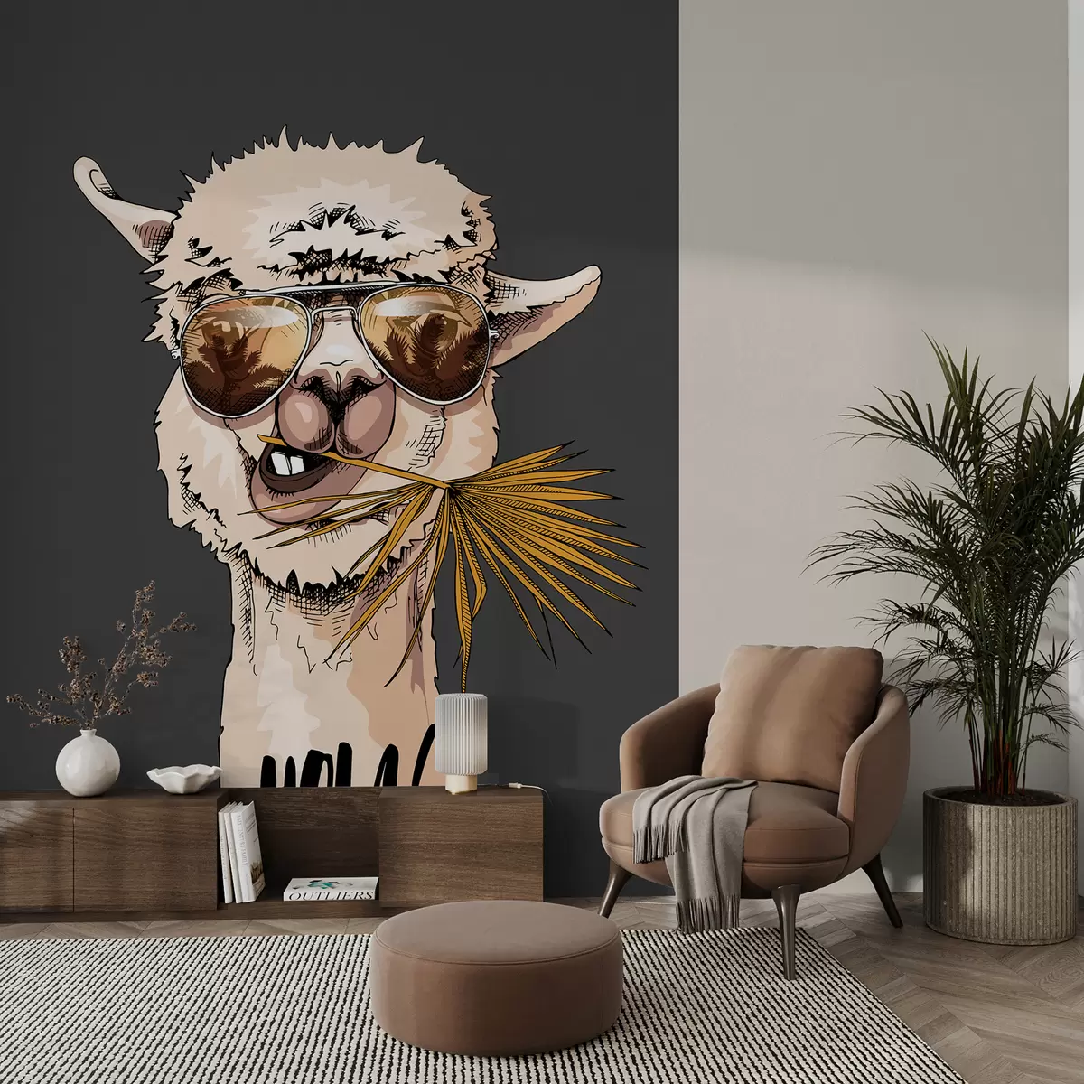 Fototapeter Portrett av en lama med solbriller og vifteformet palmeblad Nr. u98177v1