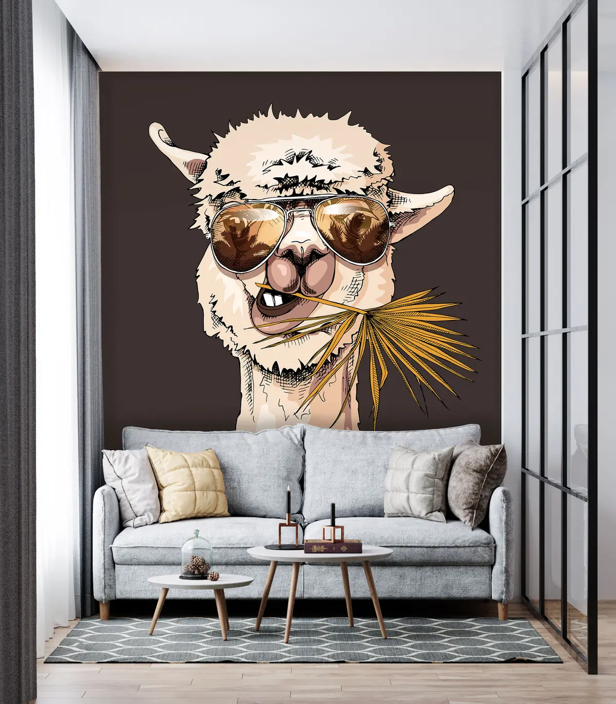 Fototapeter Portrett av en lama med solbriller og vifteformet palmeblad Nr. u98177v2
