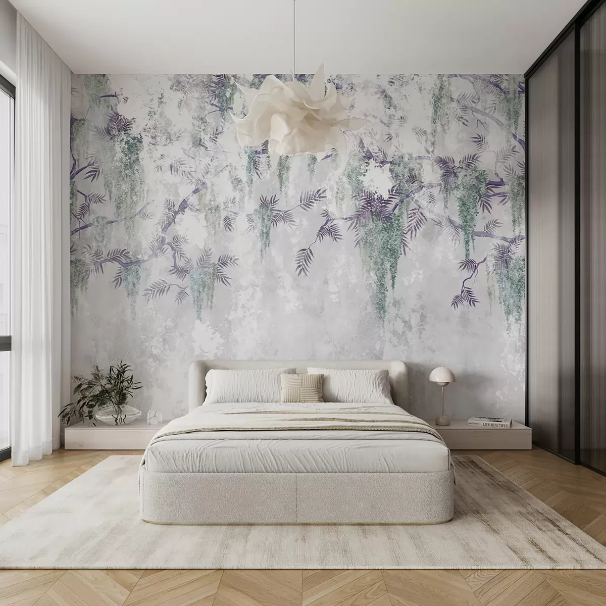 Fototapeter Hengende, trendy grunge-grener med lilla blomster i blå farger Nr. u73816v1