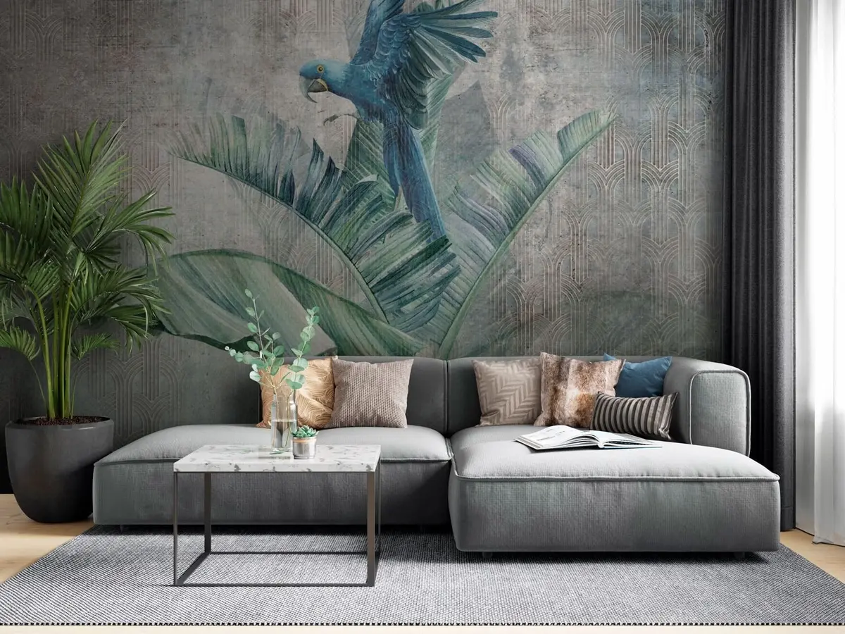 Fototapeter Stor blå papegøye på et banantre med grunge-betongtekstur Nr. u95432