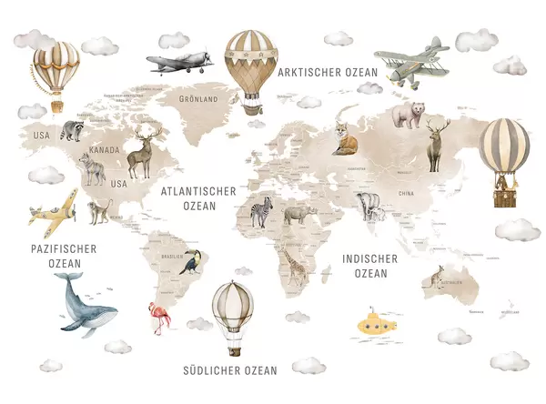 Fototapeter Barnekart i akvarellstil med dyr og varmluftsballonger. Tysk språk. Beige farge. Nr. c00001dev2