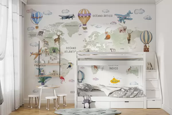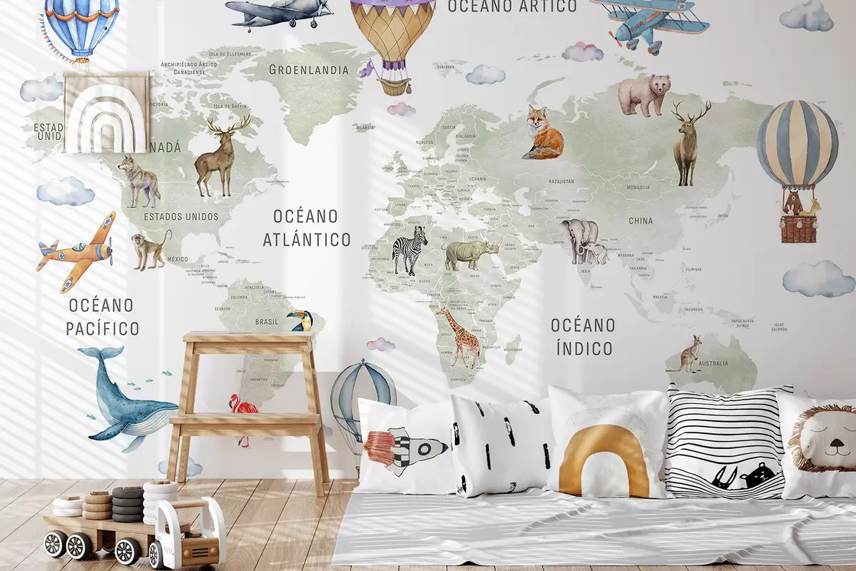 Fototapeter Barnekart i akvarellstil med dyr og varmluftsballonger. Spansk språk. Grønn farge. Nr. c00001es