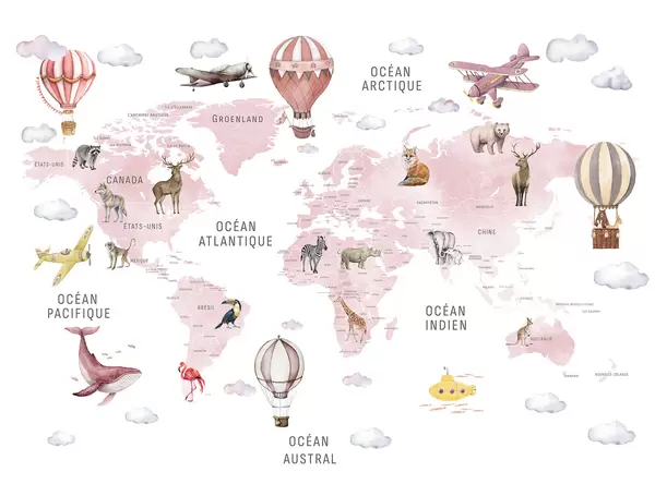 Fototapeter Barnekart i akvarellstil med dyr og varmluftsballonger. Fransk språk. Grønn farge. Nr. c00001fr