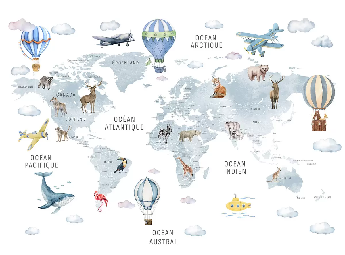 Fototapeter Barnekart i akvarellstil med dyr og varmluftsballonger. Fransk språk. Blå farge. Nr. c00001frv1