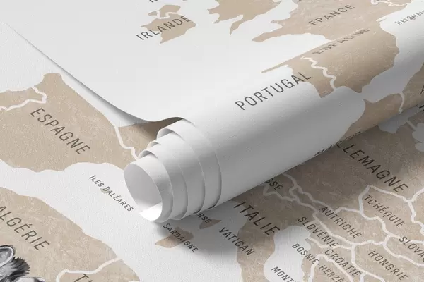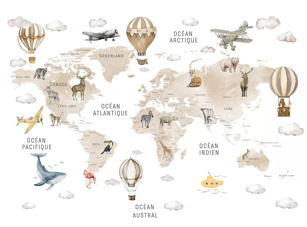 Fototapeter Barnekart i akvarellstil med dyr og varmluftsballonger. Fransk språk. Beige farge. Nr. c00001frv2