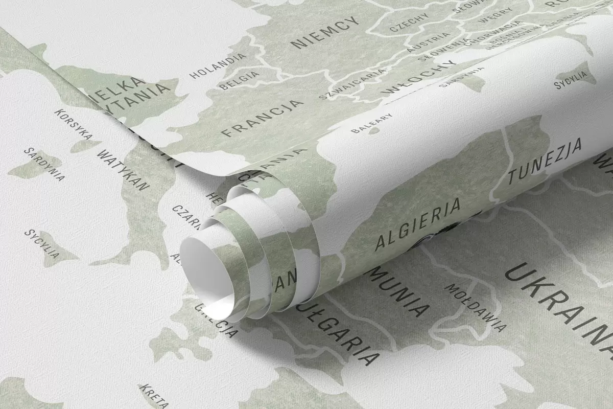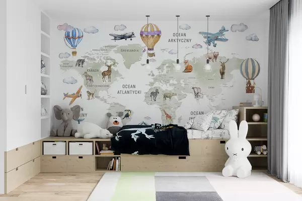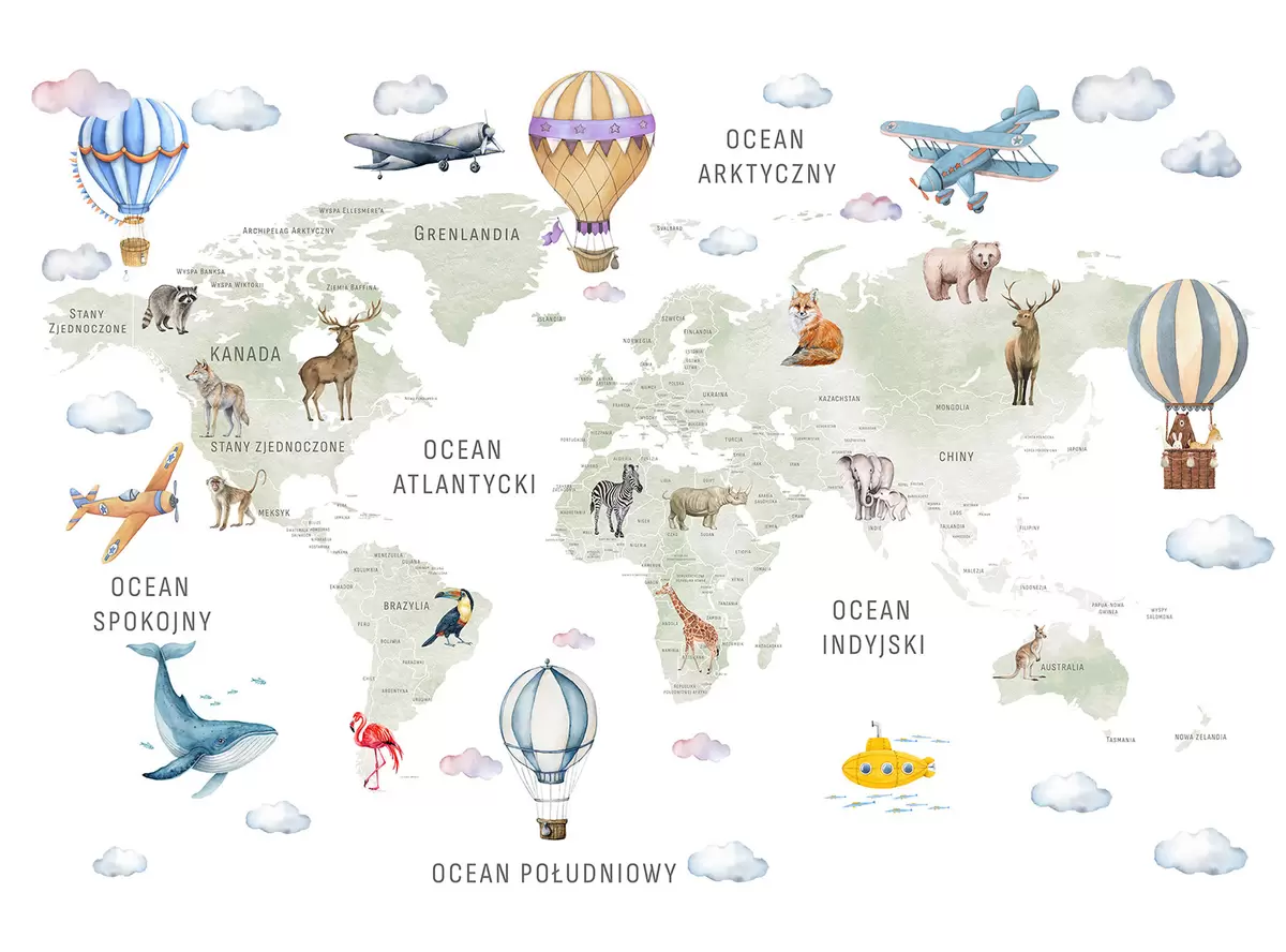 Fototapeter Barnekart i akvarellstil med dyr og varmluftsballonger. Polsk språk. Grønn farge. Nr. c00001pl