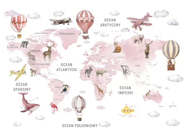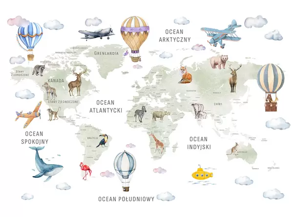 Fototapeter Barnekart i akvarellstil med dyr og varmluftsballonger. Polsk språk. Blå farge. Nr. c00001plv1