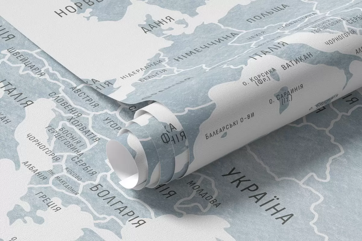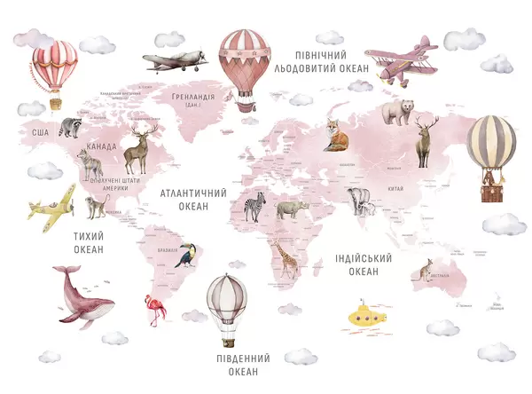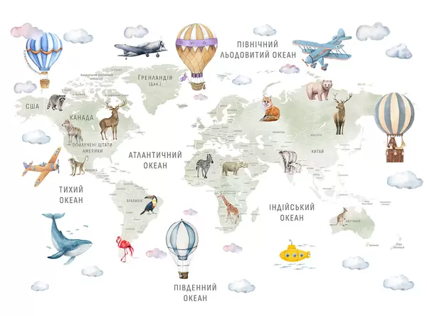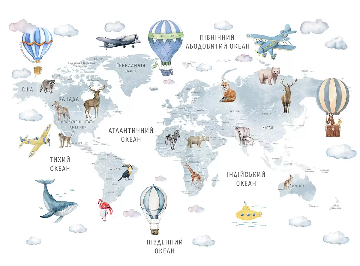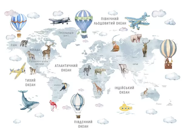 Fototapeter Barnekart i akvarellstil med dyr og varmluftsballonger. Ukrainsk språk. Blå farge. Nr. c00001ukv1