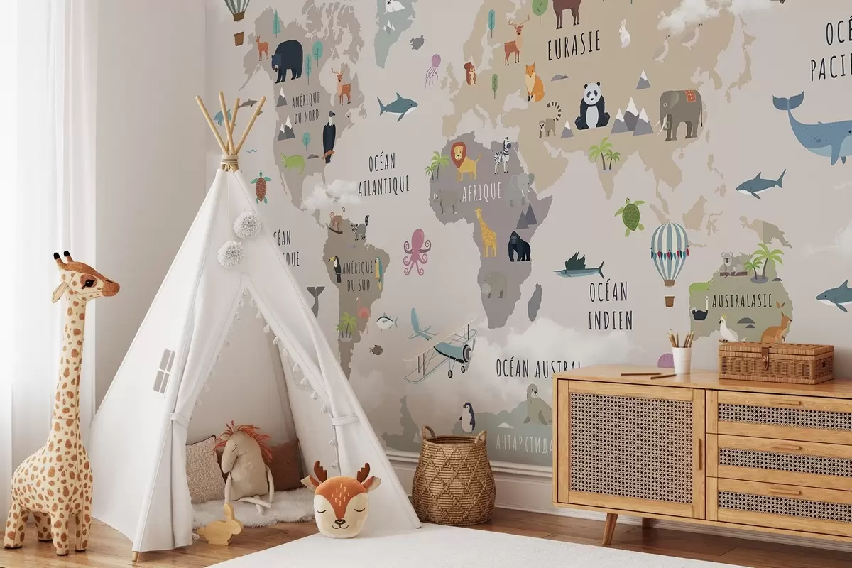 Fototapeter Barnekart over verden med dyr og varmluftsballonger. Fransk språk Nr. c00002fr