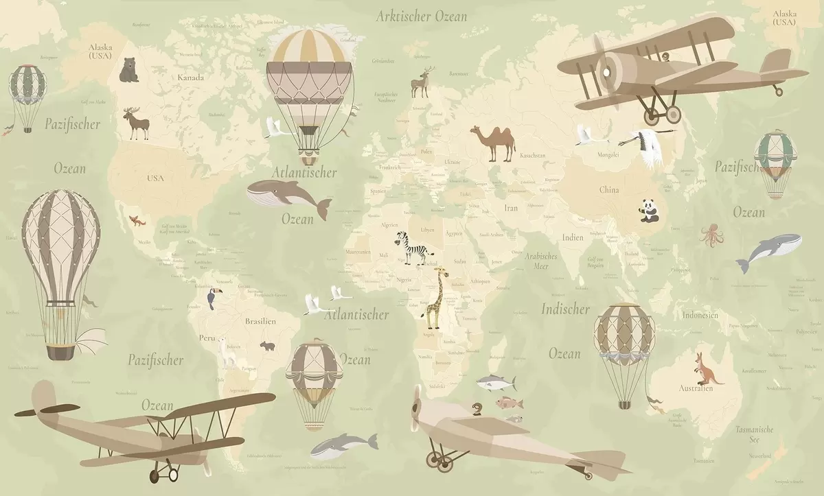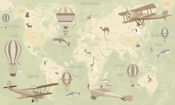 Fototapeter Barnekart over verden med dyr, fly og varmluftsballonger. Tysk språk. Grønn farge. Nr. c00003dev2