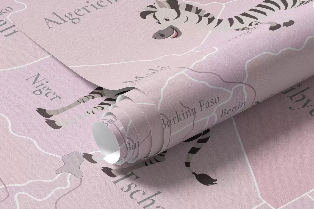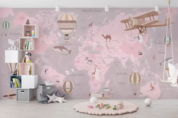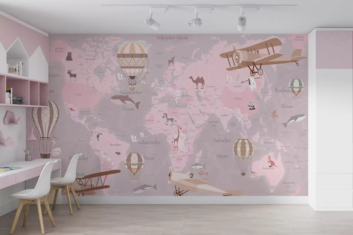 Fototapeter Barnekart over verden med dyr, fly og varmluftsballonger. Tysk språk. Rosa farge. Nr. c00003dev3