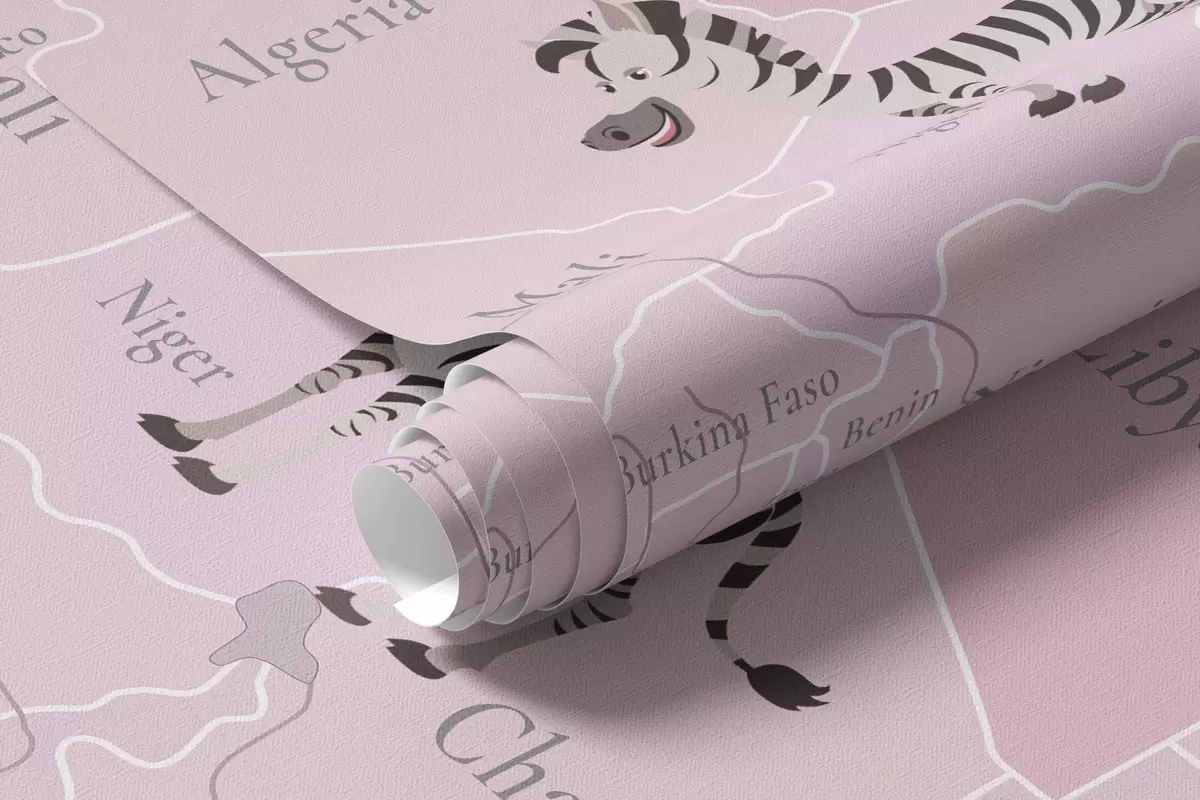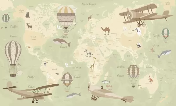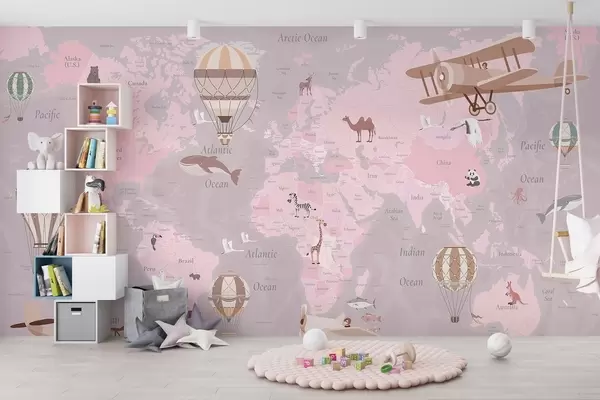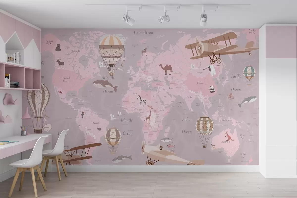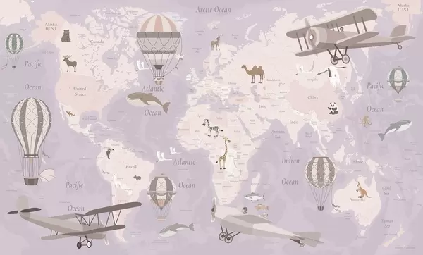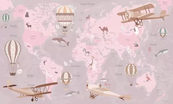 Fototapeter Barnekart over verden med dyr, fly og varmluftsballonger. Engelsk språk. Rosa farge. Nr. c00003env3