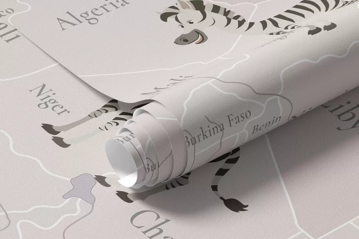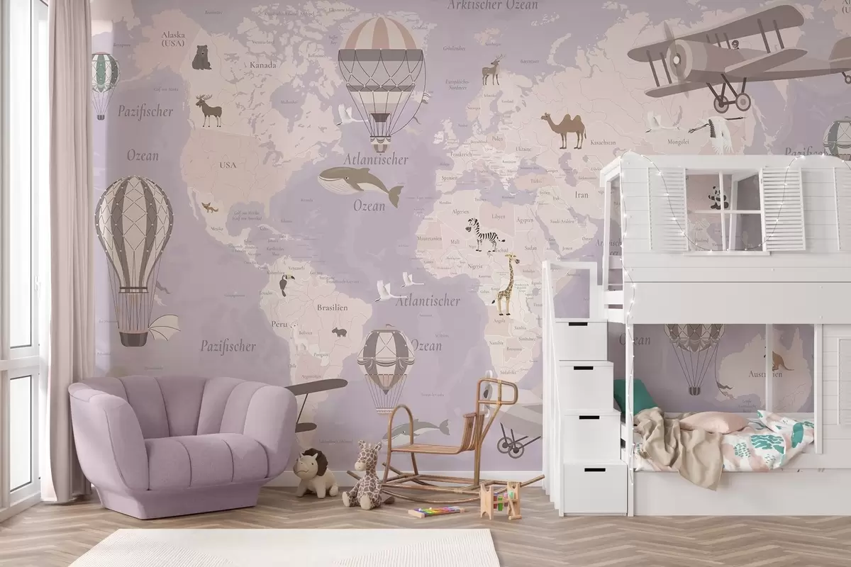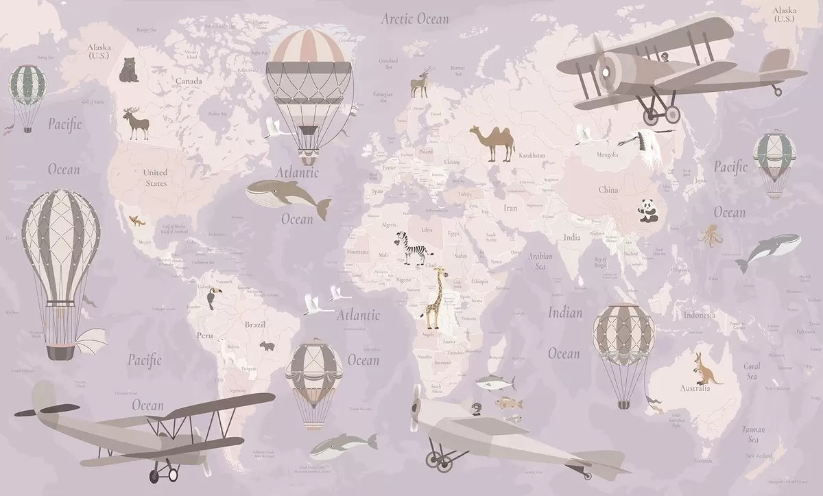 Fototapeter Barnekart over verden med dyr, fly og varmluftsballonger. Engelsk språk. Lilla farge. Nr. c00003env4