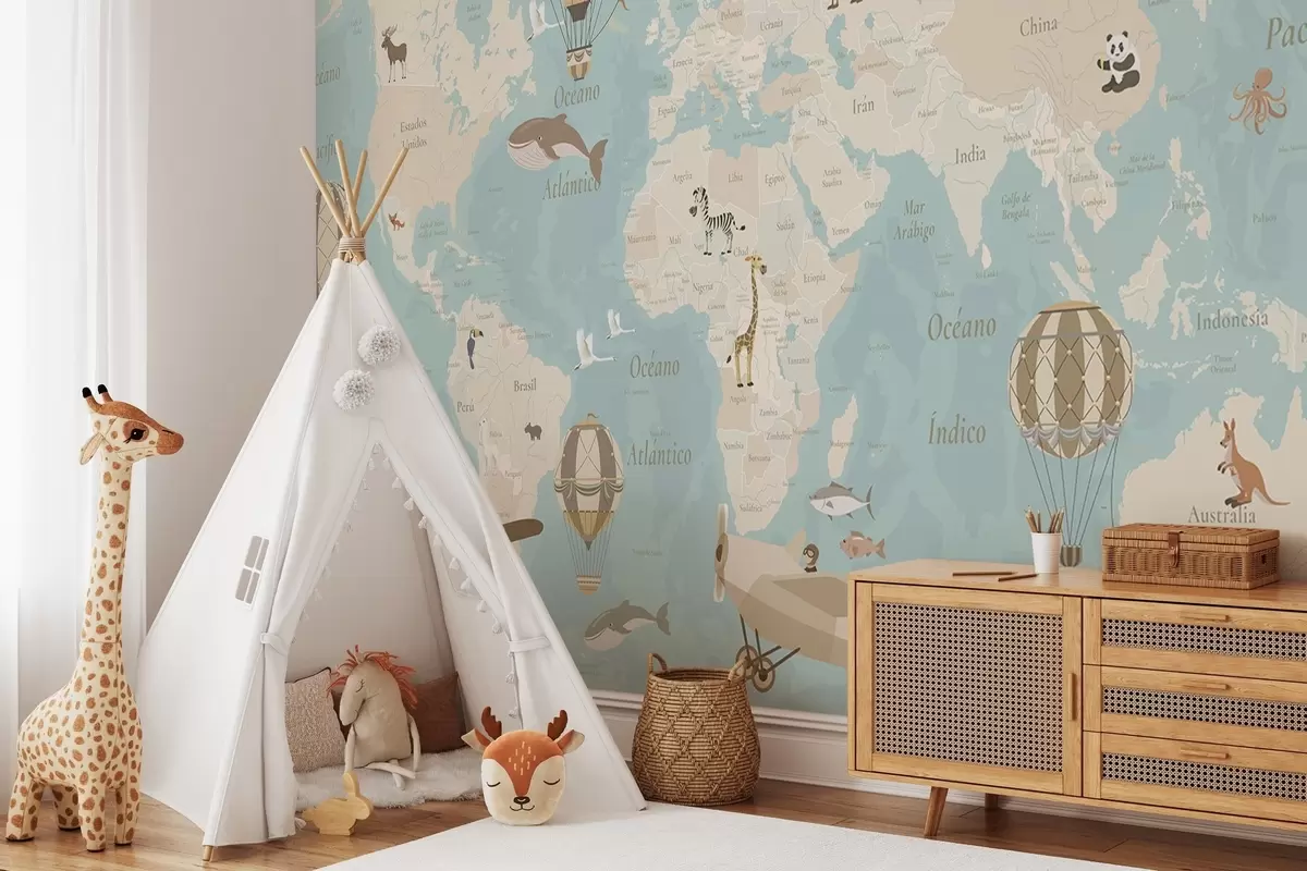 Fototapeter Barnekart over verden med dyr, fly og varmluftsballonger. Spansk språk. Blå farge. Nr. c00003esv1