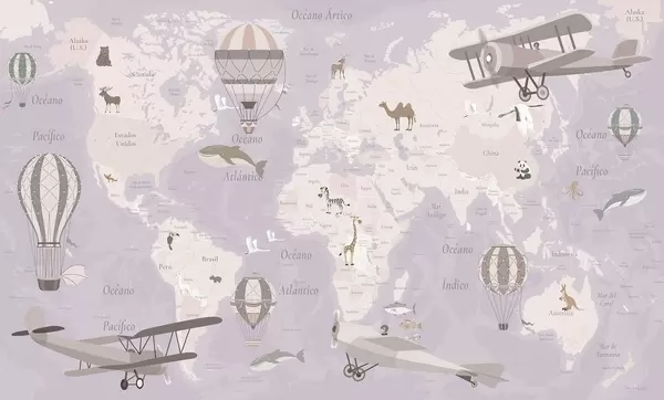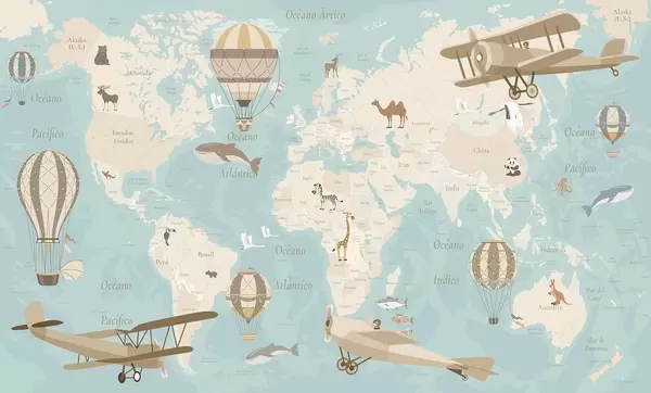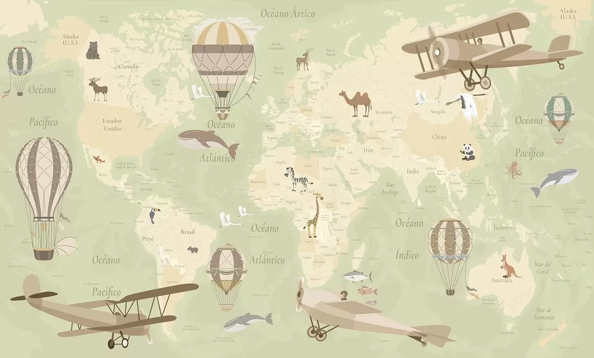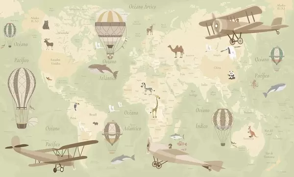 Fototapeter Barnekart over verden med dyr, fly og varmluftsballonger. Spansk språk. Grønn farge. Nr. c00003esv2