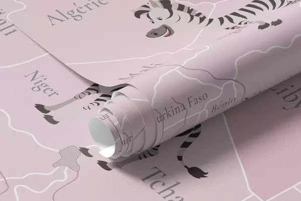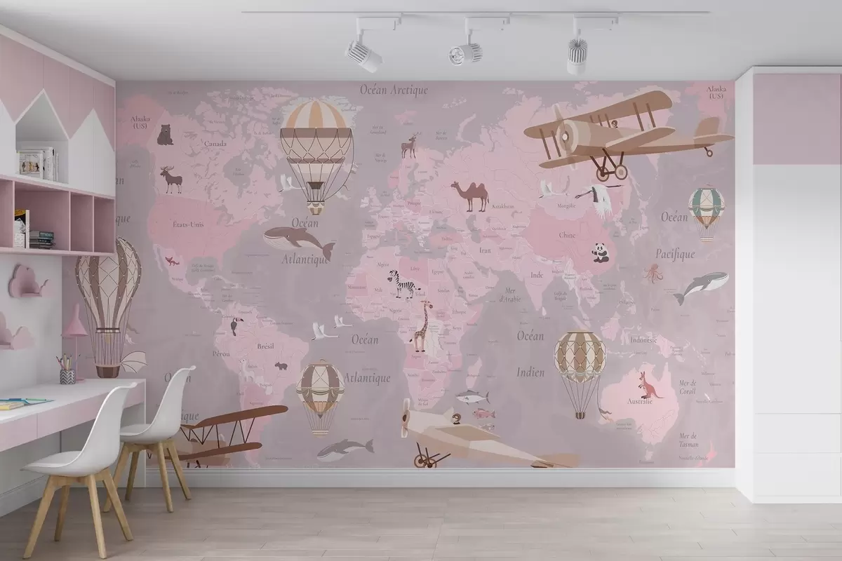 Fototapeter Barnekart over verden med dyr, fly og varmluftsballonger. Fransk språk. Rosa farge. Nr. c00003frv3