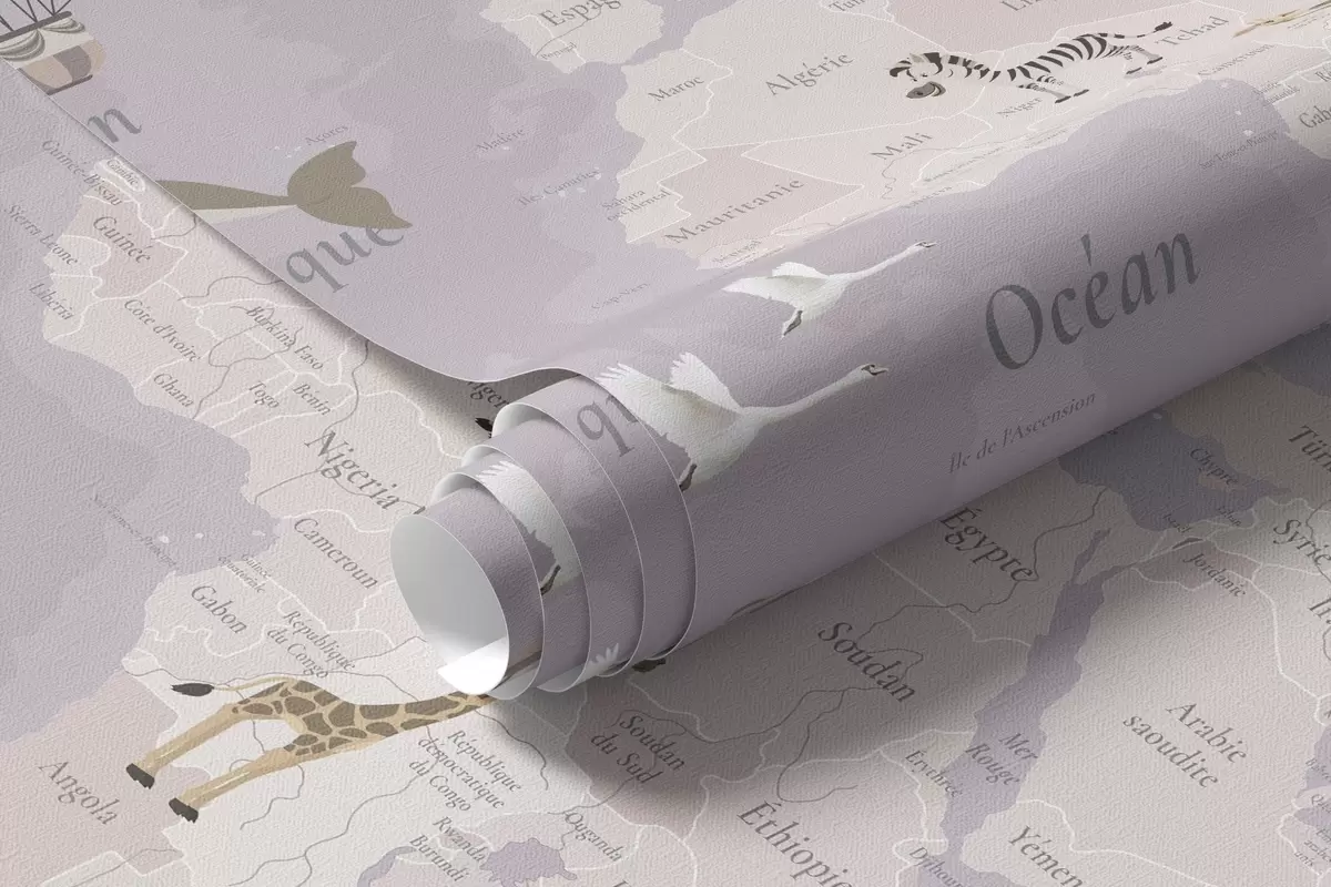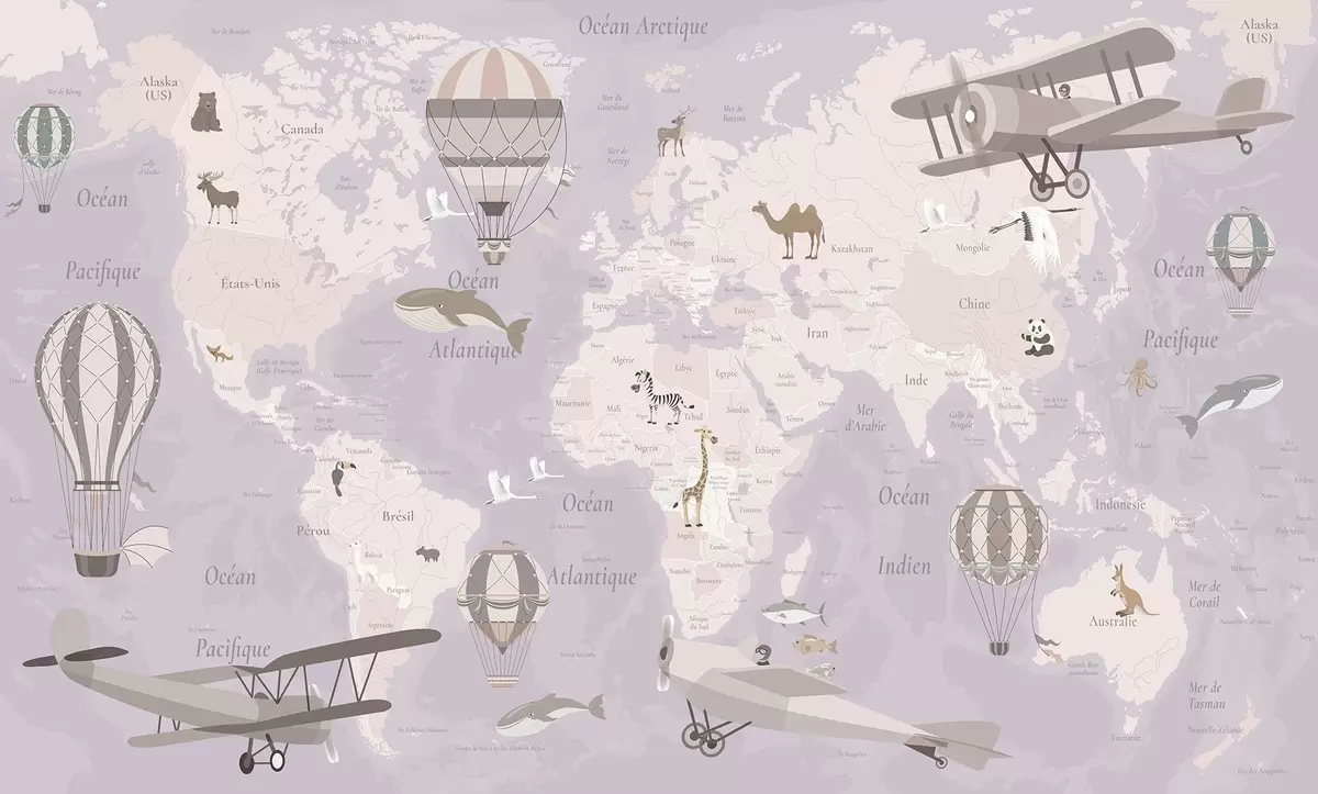 Fototapeter Barnekart over verden med dyr, fly og varmluftsballonger. Fransk språk. Lilla farge. Nr. c00003frv4