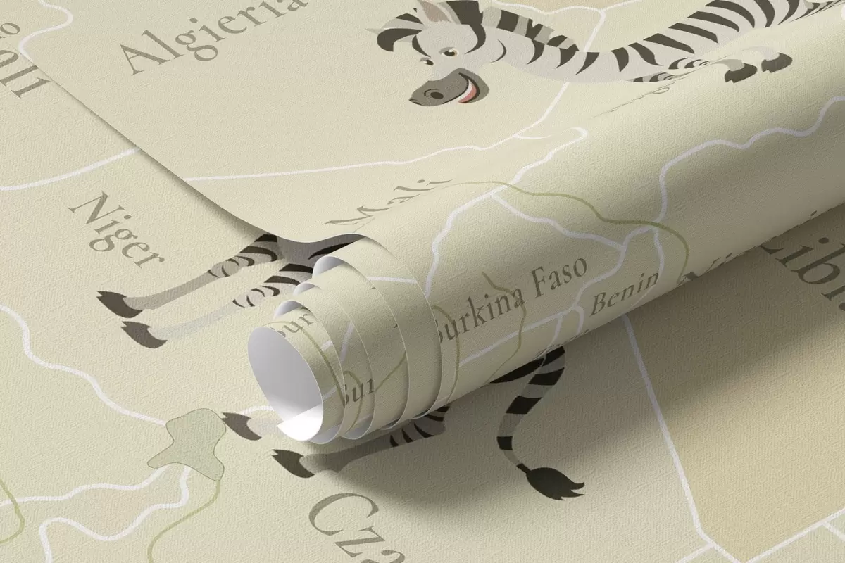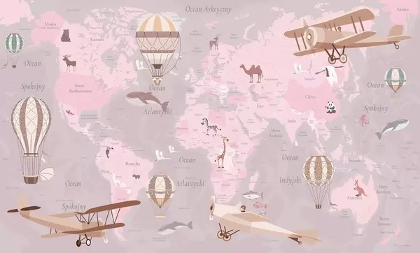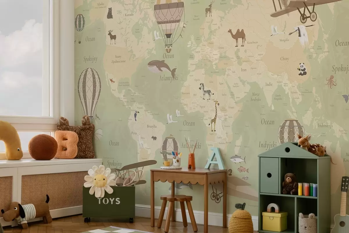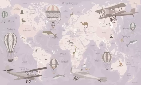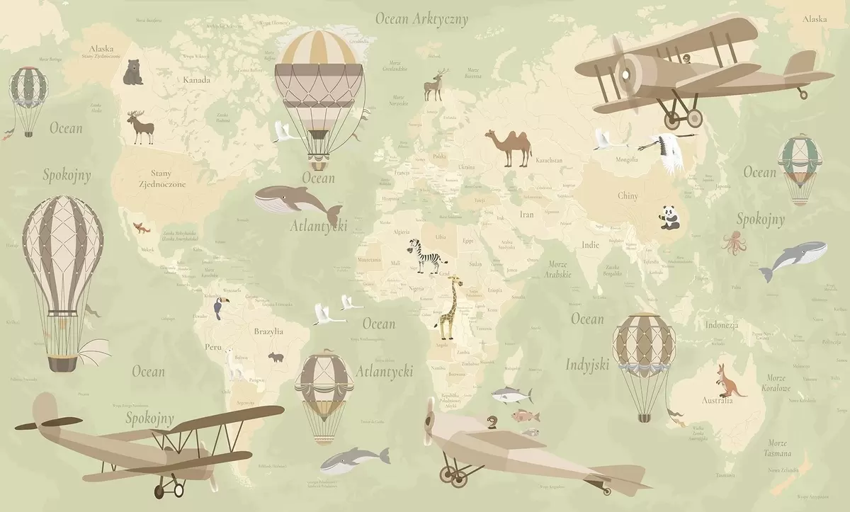 Fototapeter Barnekart over verden med dyr, fly og varmluftsballonger. Polsk språk. Grønn farge. Nr. c00003plv2