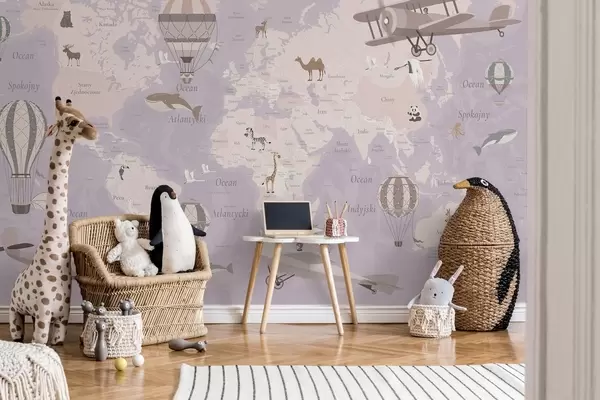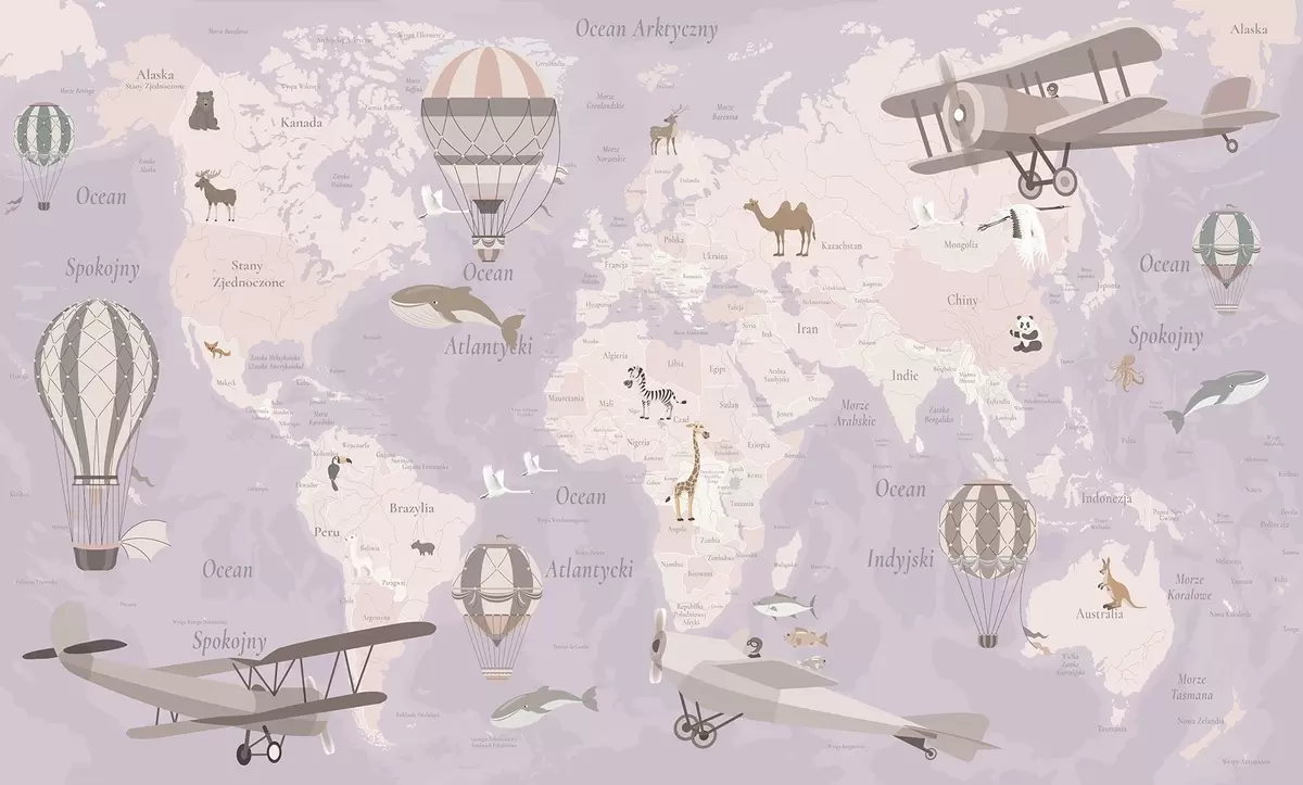 Fototapeter Barneverdenskart med dyr, fly og varmluftsballonger. Polsk språk. Lilla farge. Nr. c00003plv4