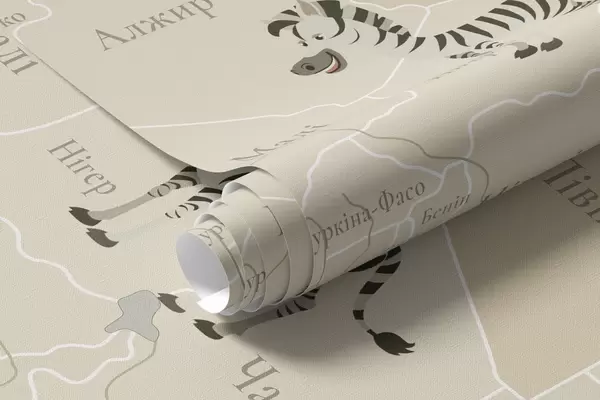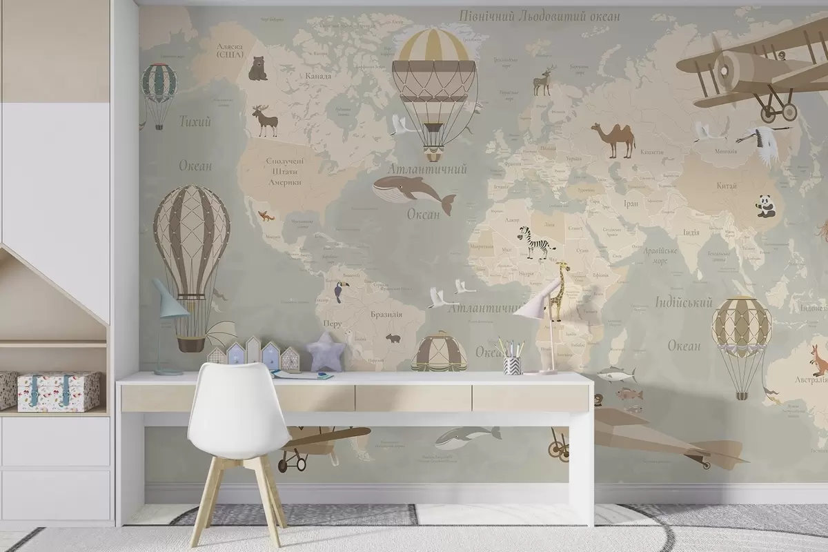 Fototapeter Barnekart over verden med dyr, fly og varmluftsballonger. Ukrainsk språk. Beige farge. Nr. c00003uk