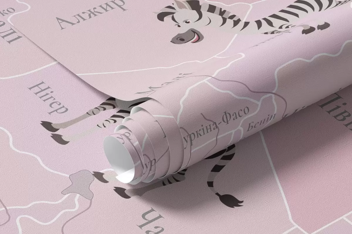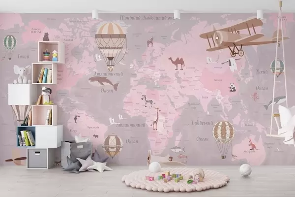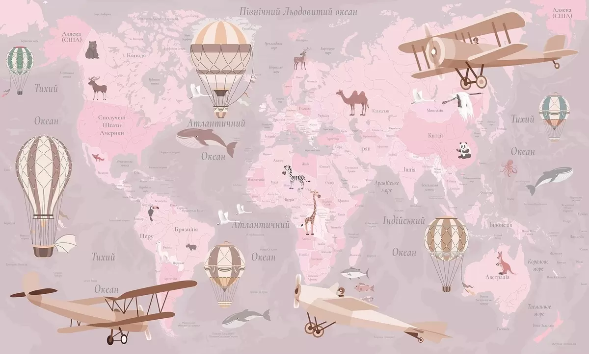 Fototapeter Barnekart over verden med dyr, fly og varmluftsballonger. Ukrainsk språk. Rosa farge. Nr. c00003ukv3