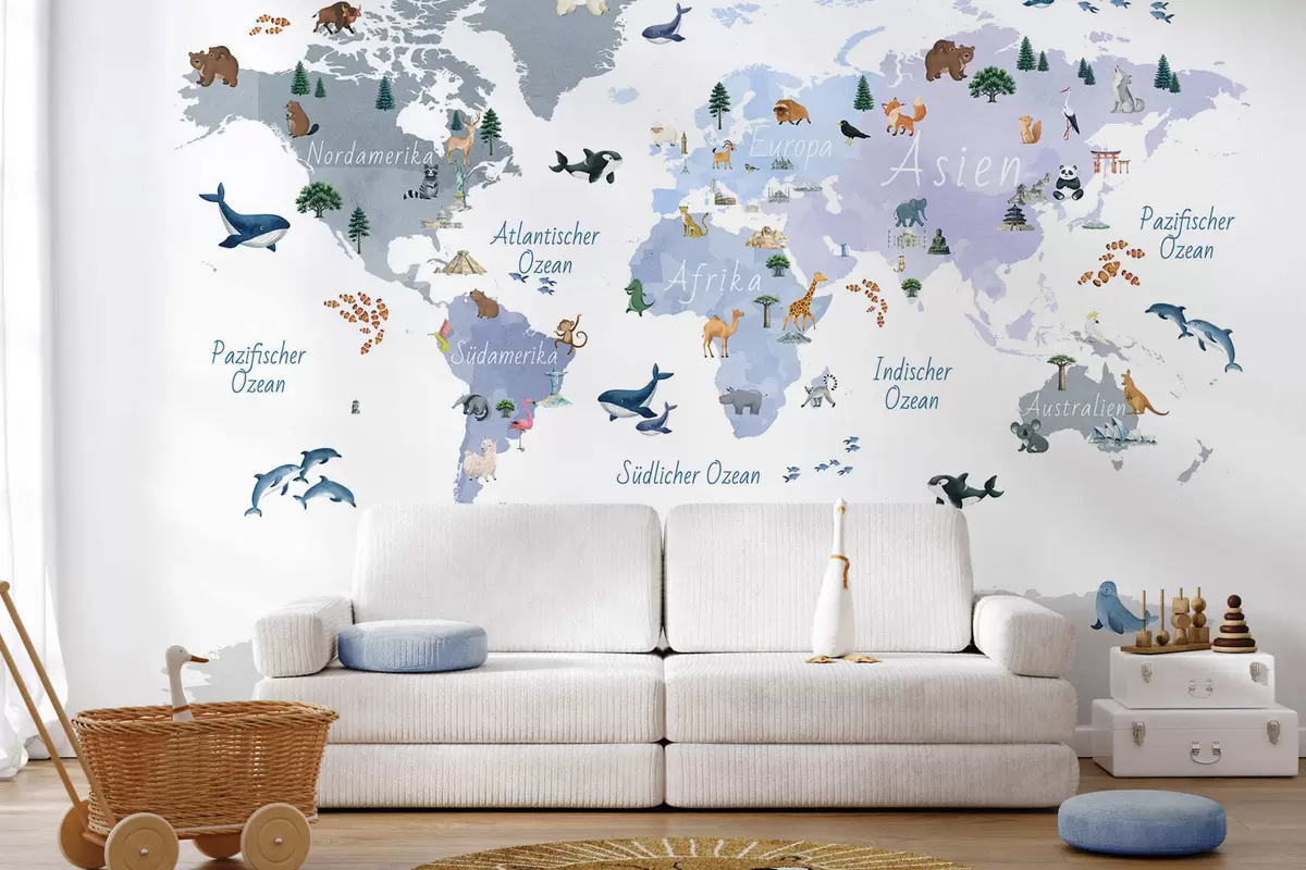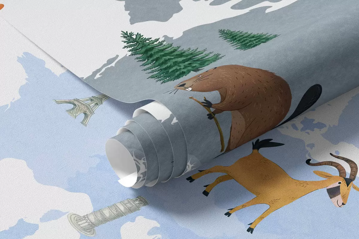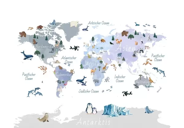 Fototapeter Et blått kart i akvarellstil med dyr, planter og arkitektur. Tekst på tysk Nr. c00009dev1