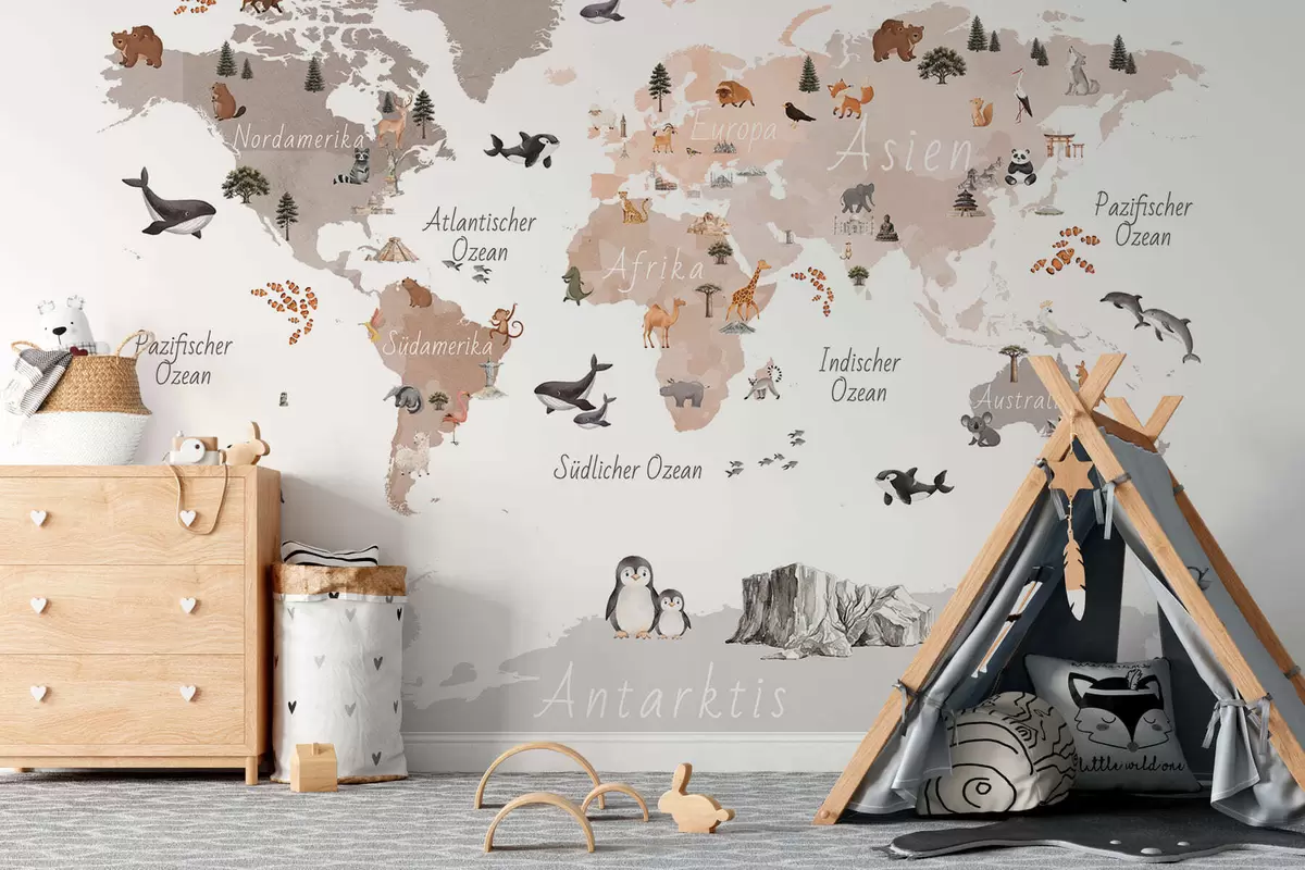 Fototapeter Et kart i akvarellstil i beige farger med dyr, planter og arkitektur. Betegnelser på tysk Nr. c00009dev3