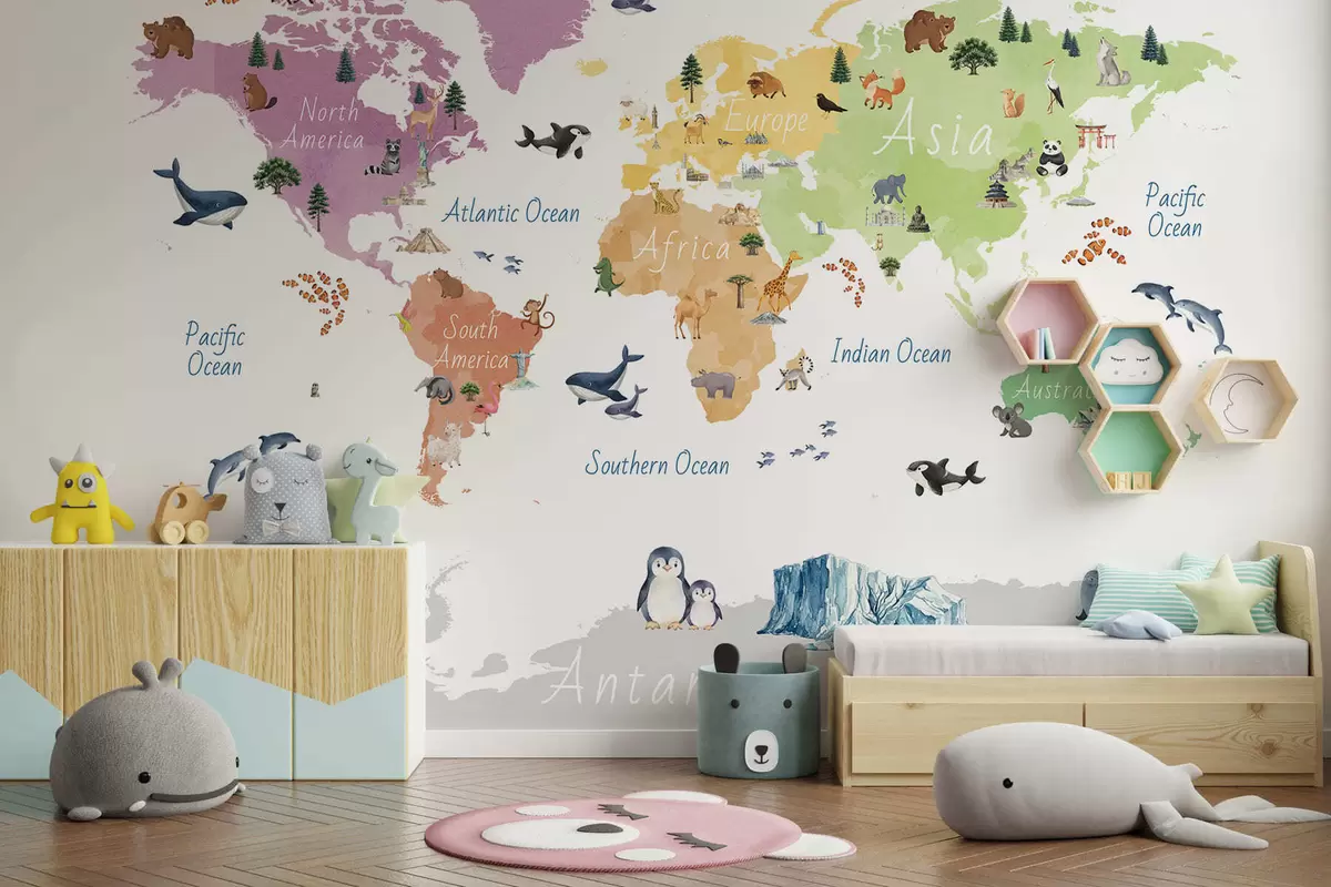 Fototapeter Et fargekart i akvarellstil med dyr, planter og arkitektur. Tekst på engelsk Nr. c00009en
