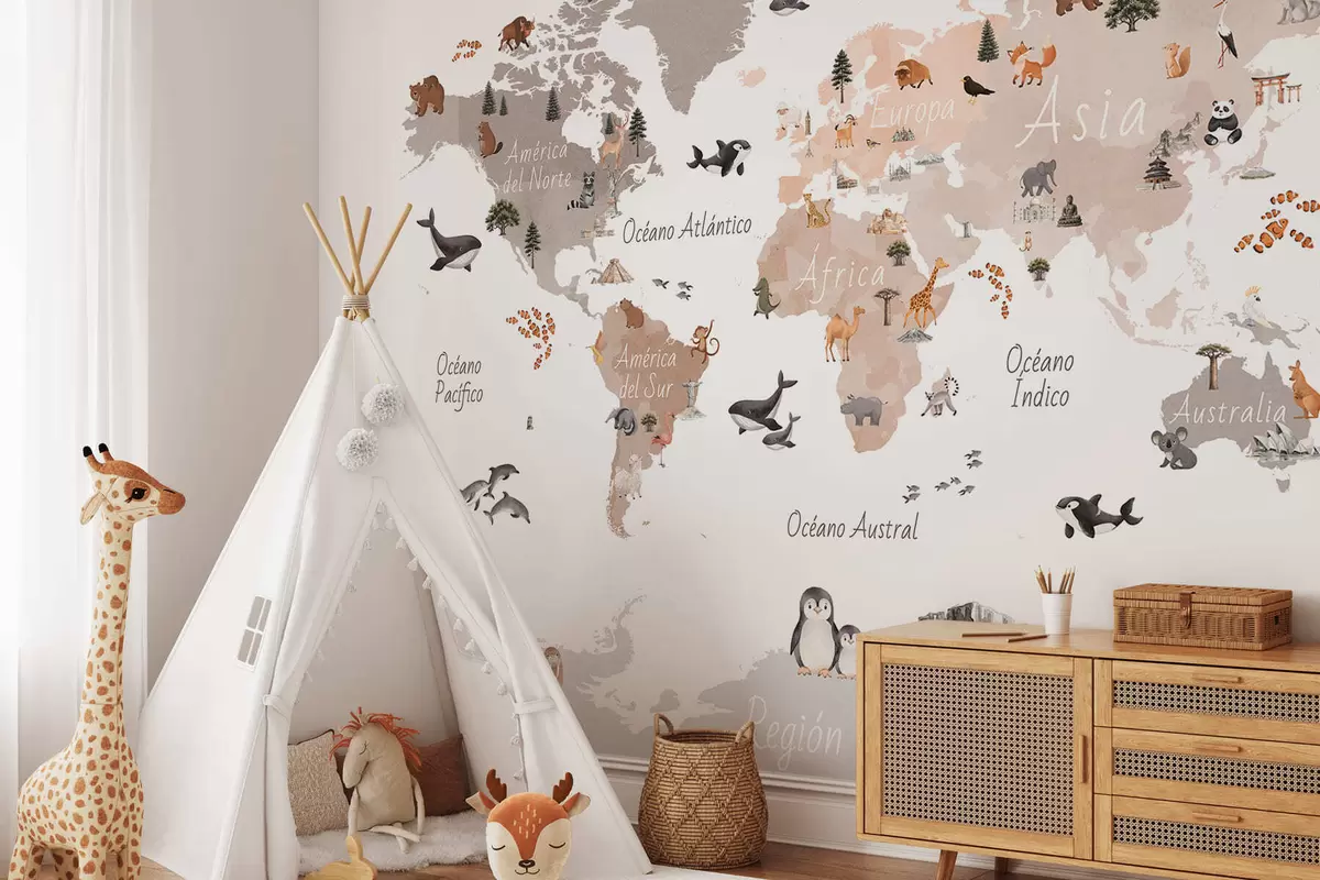 Fototapeter Et kart i akvarellstil i beige farger med dyr, planter og arkitektur. Betegnelser på spansk Nr. c00009esv3