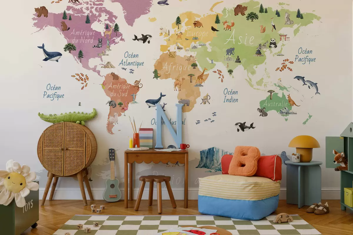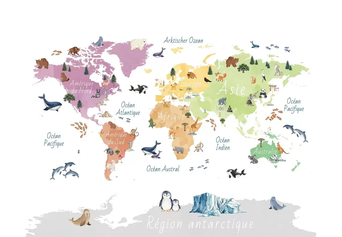 Fototapeter Et fargekart i akvarellstil med dyr, planter og arkitektur. Tekster på fransk Nr. c00009fr