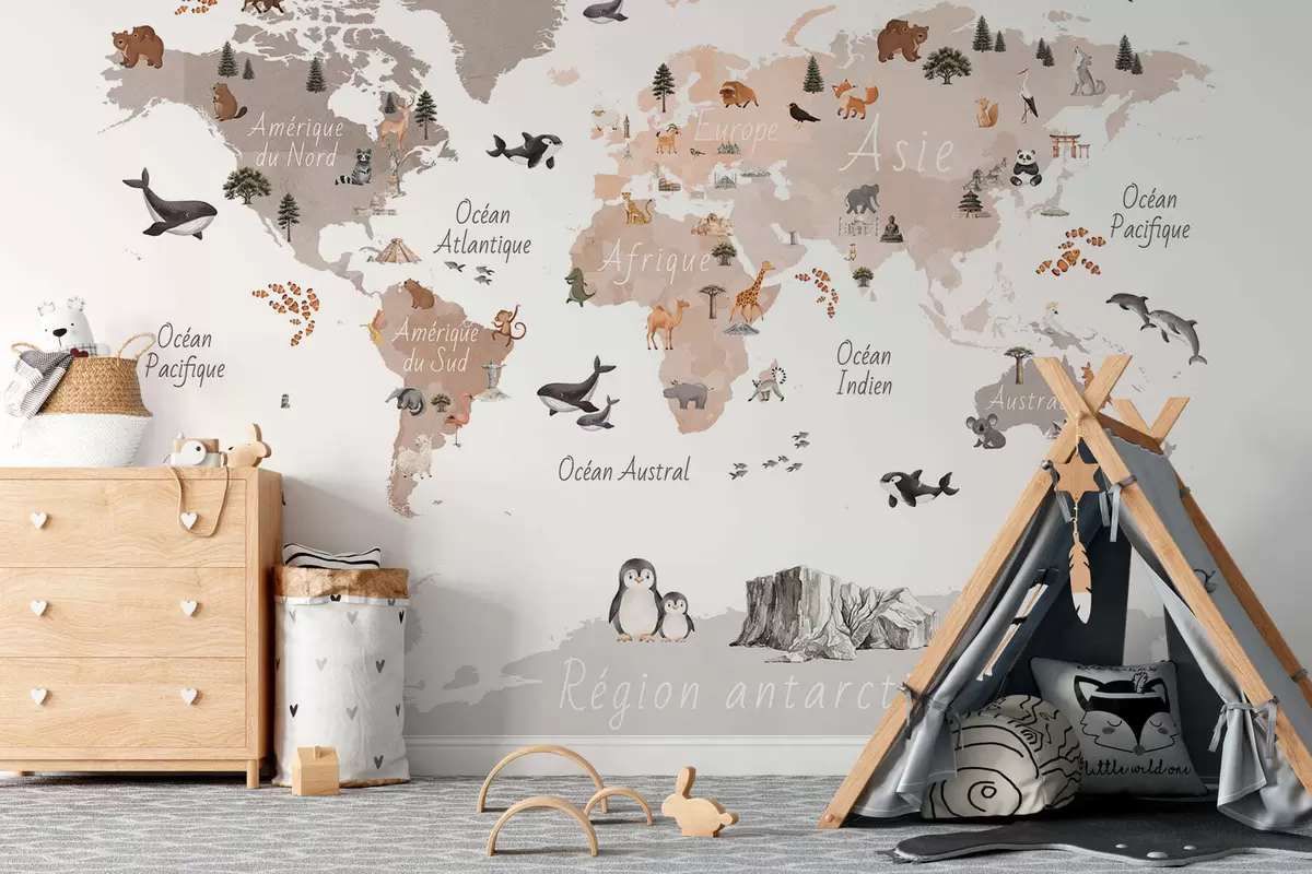 Fototapeter Et kart i akvarellstil i beige farger med dyr, planter og arkitektur. Betegnelser på fransk Nr. c00009frv3