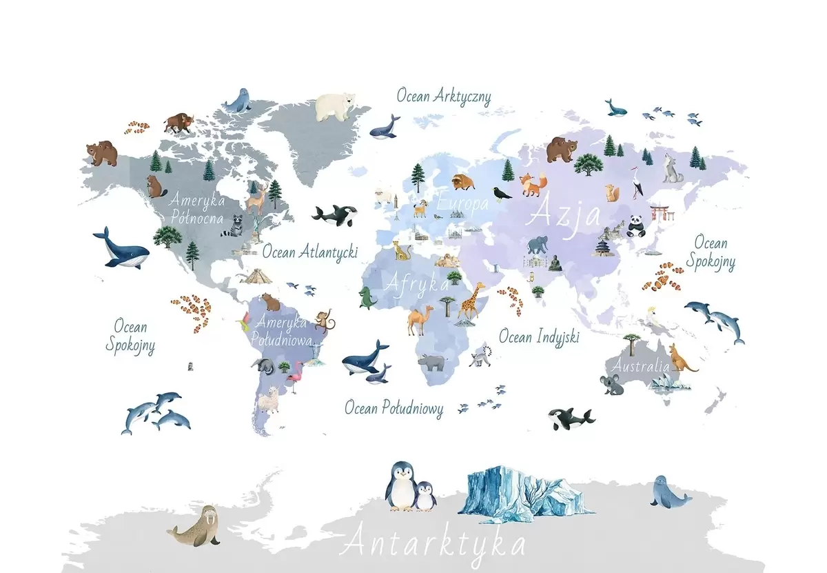 Fototapeter Et blått kart i akvarellstil med dyr, planter og arkitektur. Tekster på polsk Nr. c00009plv1