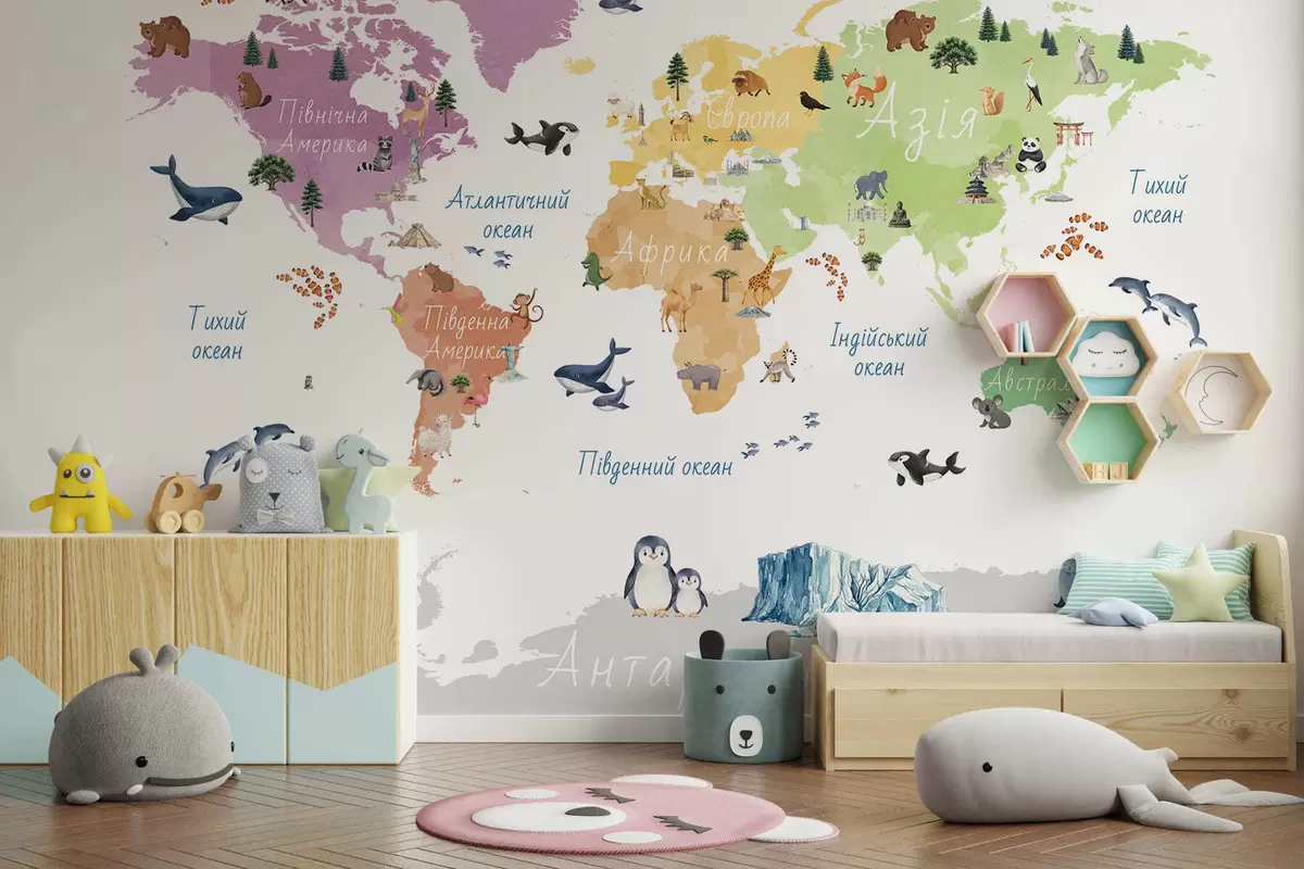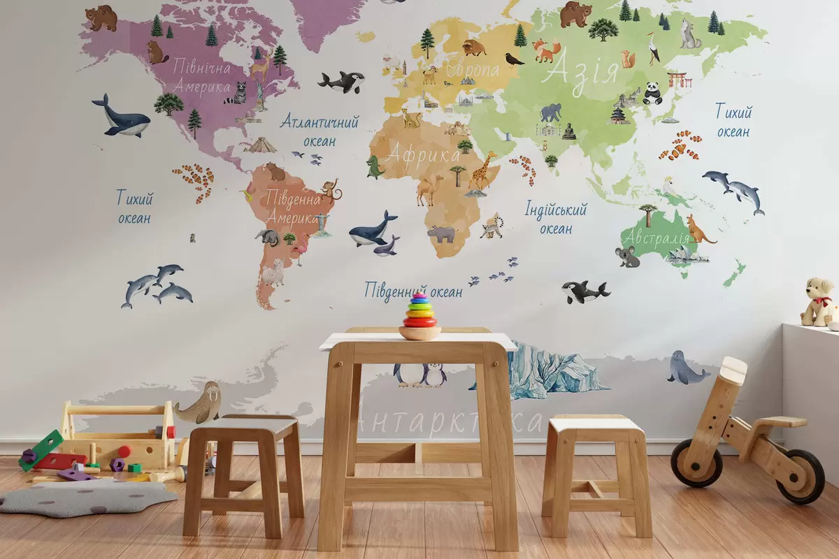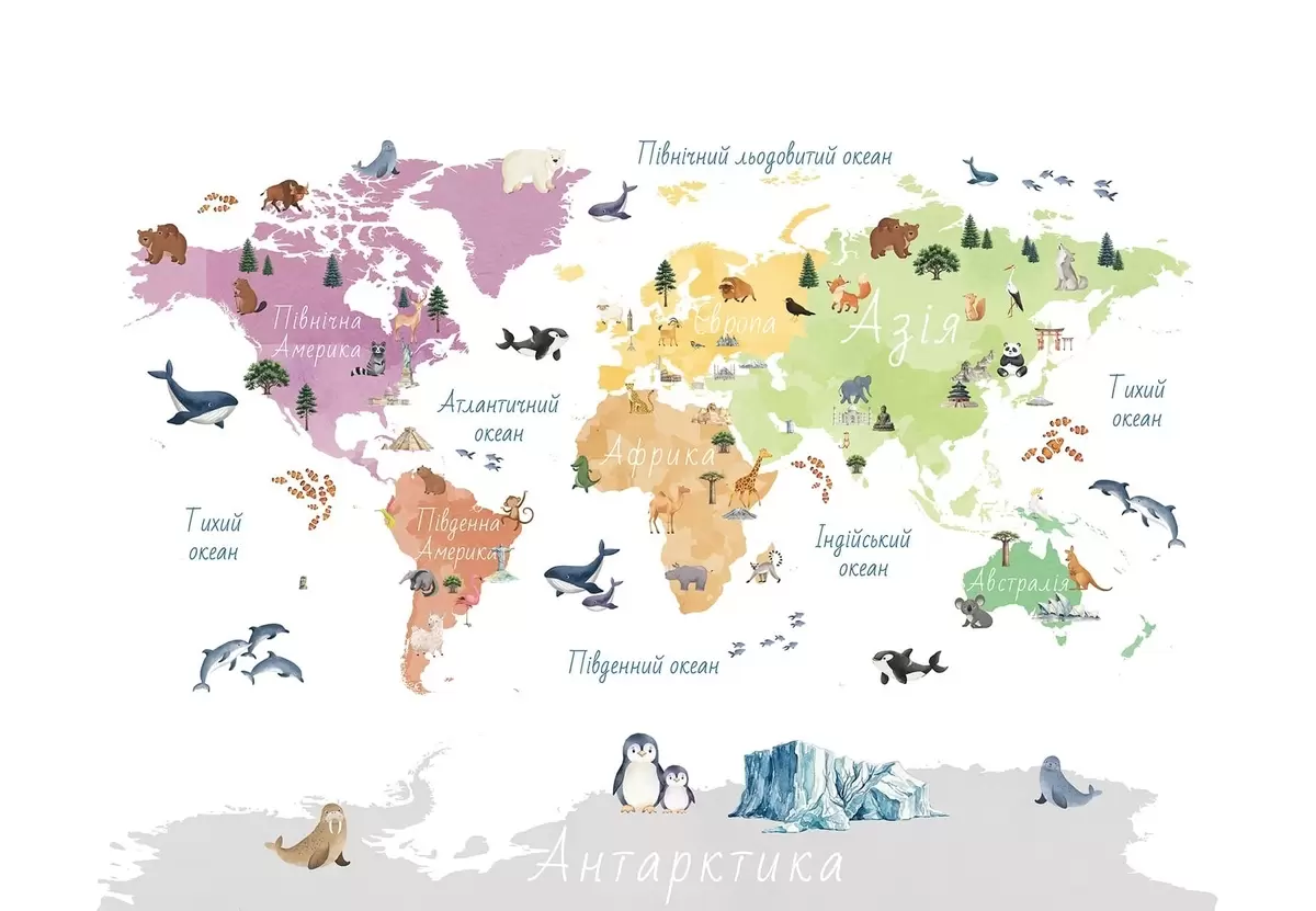 Fototapeter Et fargekart i akvarellstil med dyr, planter og arkitektur. Tekst på ukrainsk Nr. c00009uk