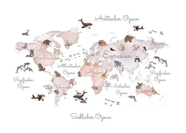 Fototapeter Et beige kart i akvarellstil med dyr. Betegnelser på tysk Nr. c00012dev3