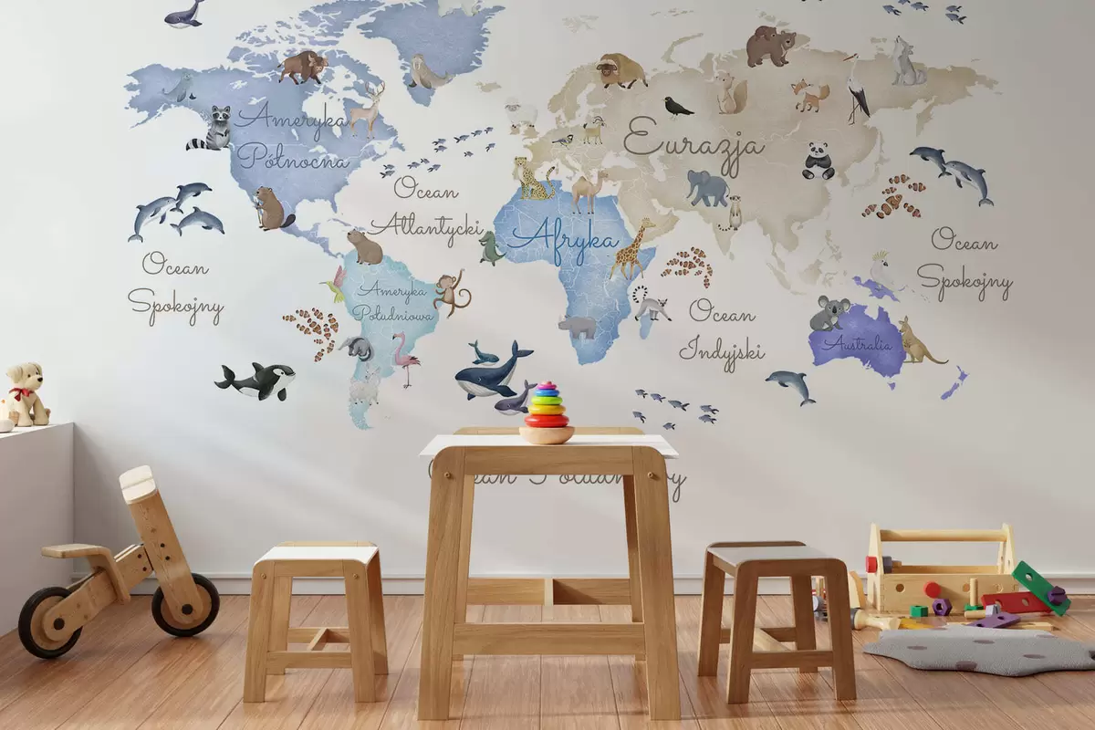 Fototapeter Et blått kart i akvarellstil med dyr. Betegnelser på polsk Nr. c00012plv1