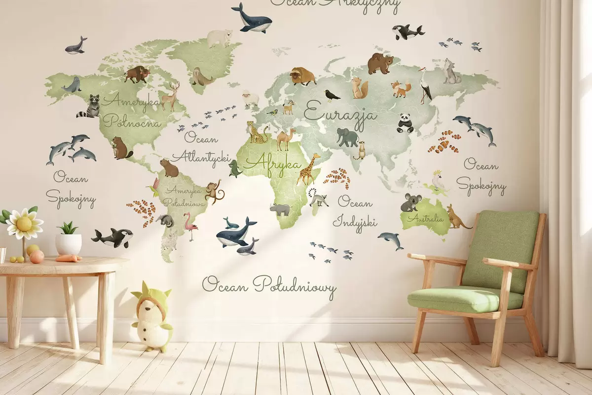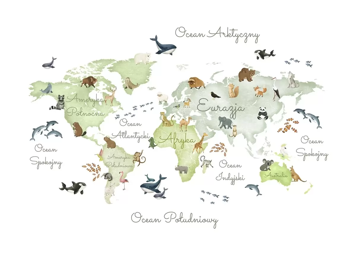 Fototapeter Et grønt kart i akvarellstil med dyr. Tekster på polsk Nr. c00012plv2