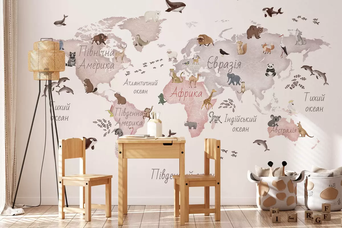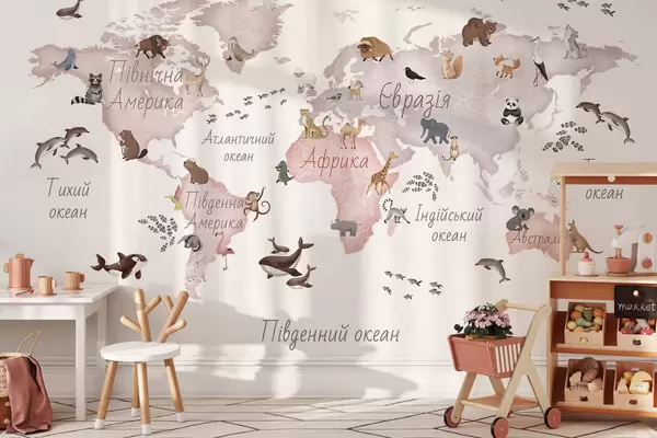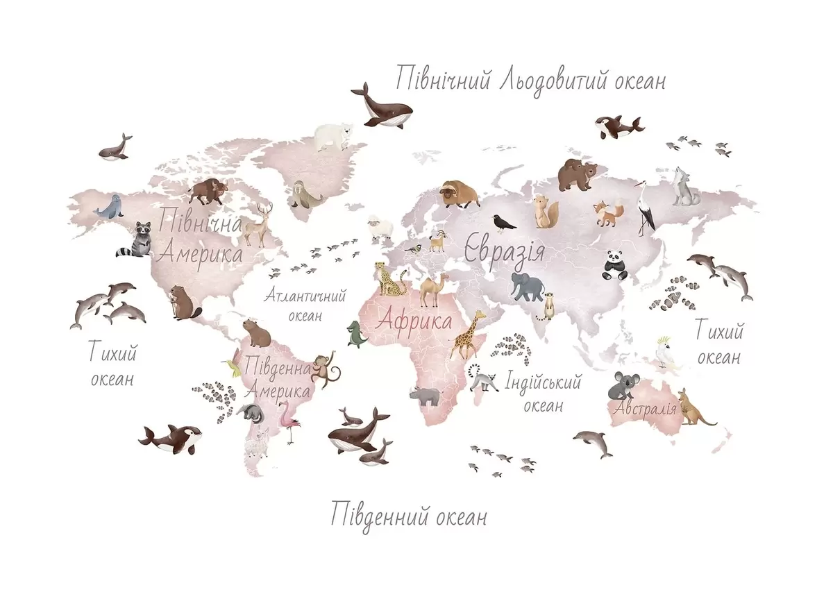 Fototapeter Et beige kart i akvarellstil med dyr. Betegnelser på ukrainsk Nr. c00012ukv3