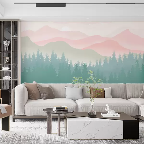 Fototapeter Tåkete fjell med furuskog, myke naturlige farger, rosa og grønt Nr. u98774