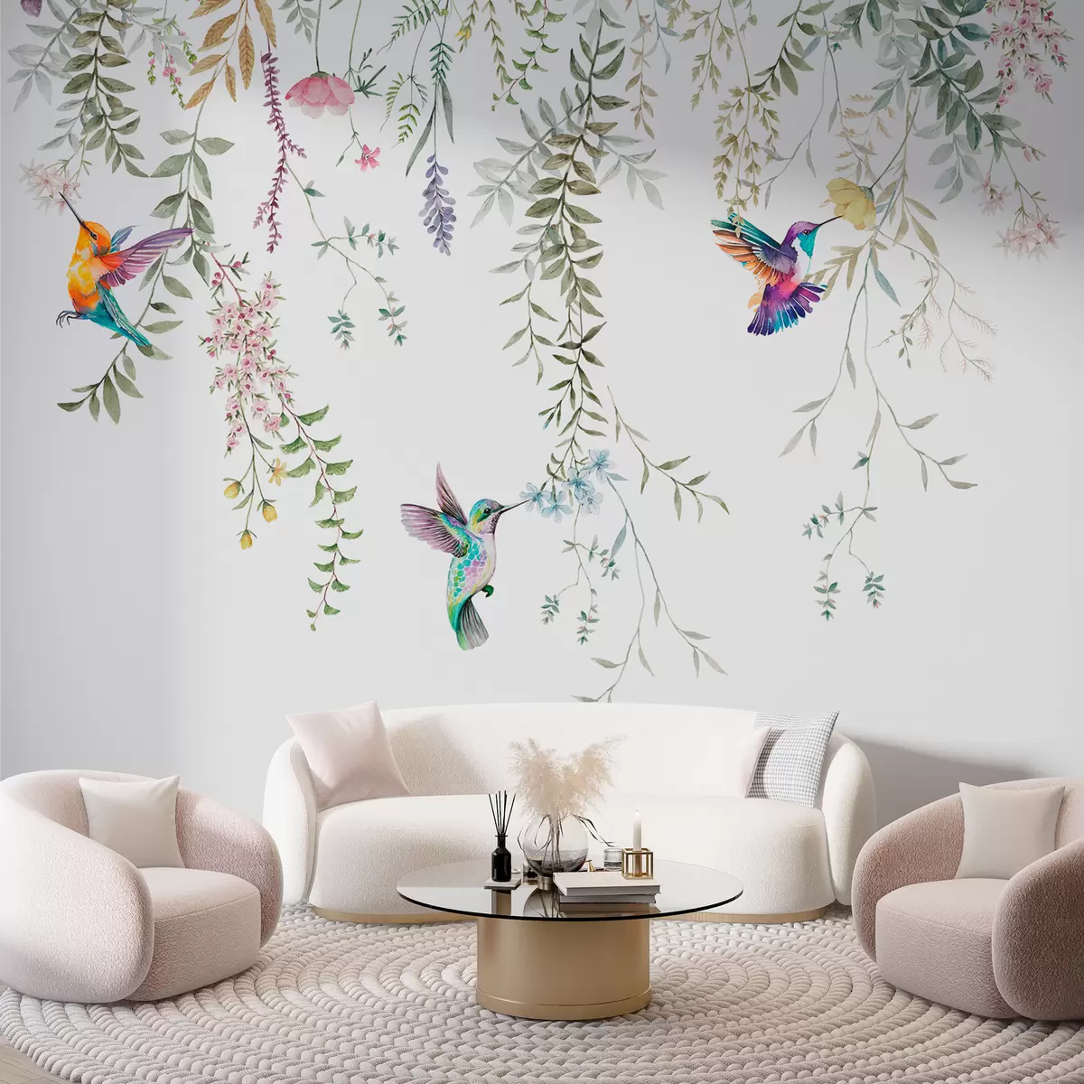 Fototapeter Hengende blomster og blader og vakre kolibrier Nr. w00660