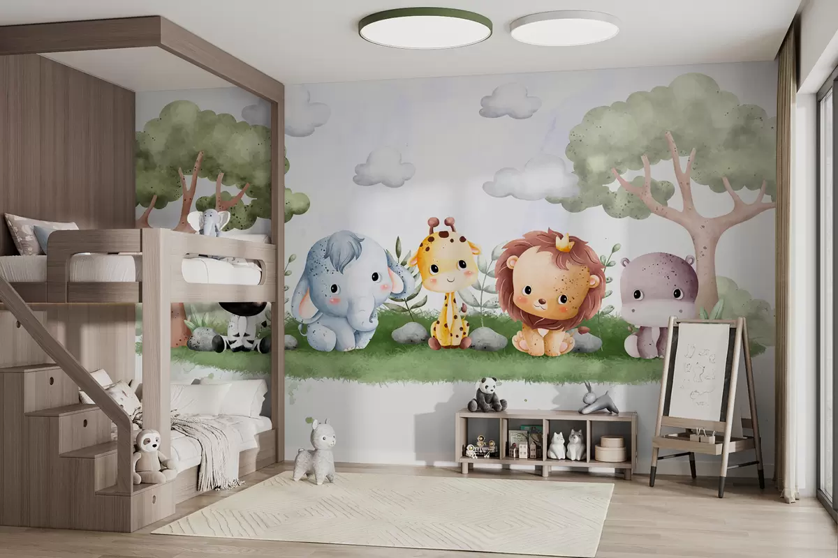 Fototapeter En gruppe søte tegneseriedyr som sitter på en gressmark med trær og skyer i bakgrunnen Nr. w00705