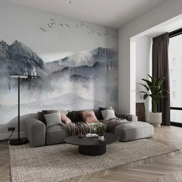 Fototapeter Landskap med fjell i bakgrunnen, med noen få trær synlige i forgrunnen rolig Nr. w00707