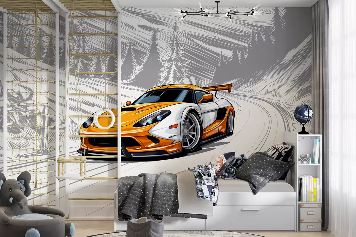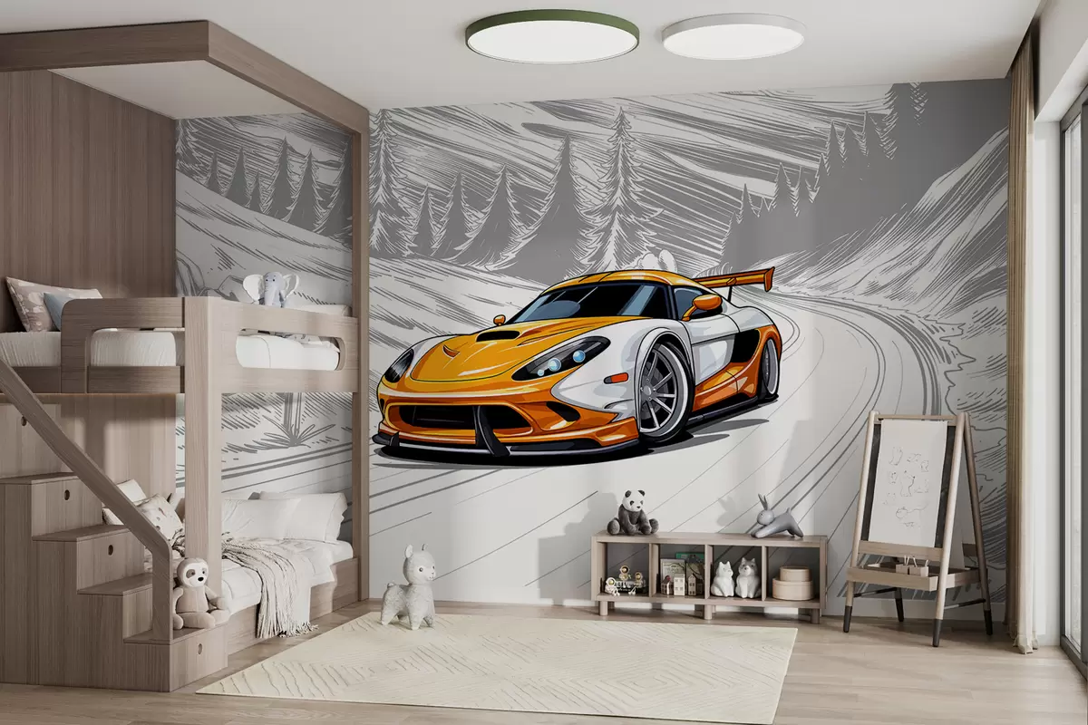 Fototapeter En oransje sportsbil på en grå, skisseaktig veibakgrunn blant fjell og grantrær. For å dekorere et gutterom Nr. w00954