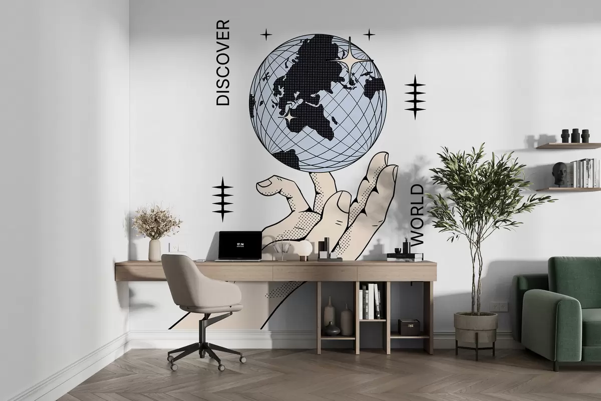 Fototapeter Beige hånd som snurrer kloden på en hvit bakgrunn for rom- eller kontordekorasjon Nr. w00984