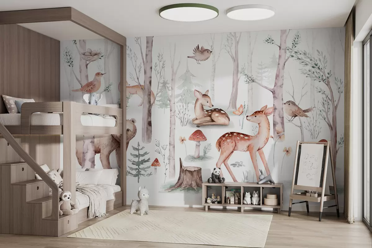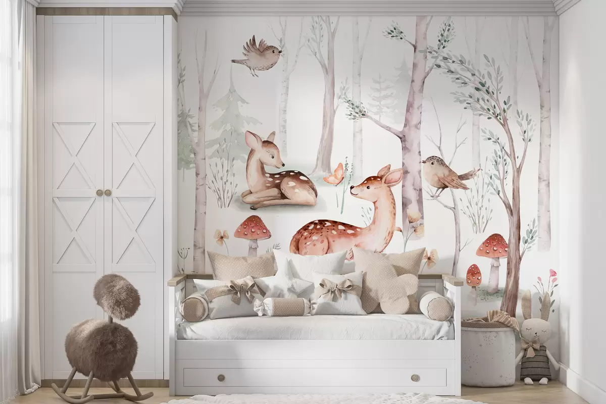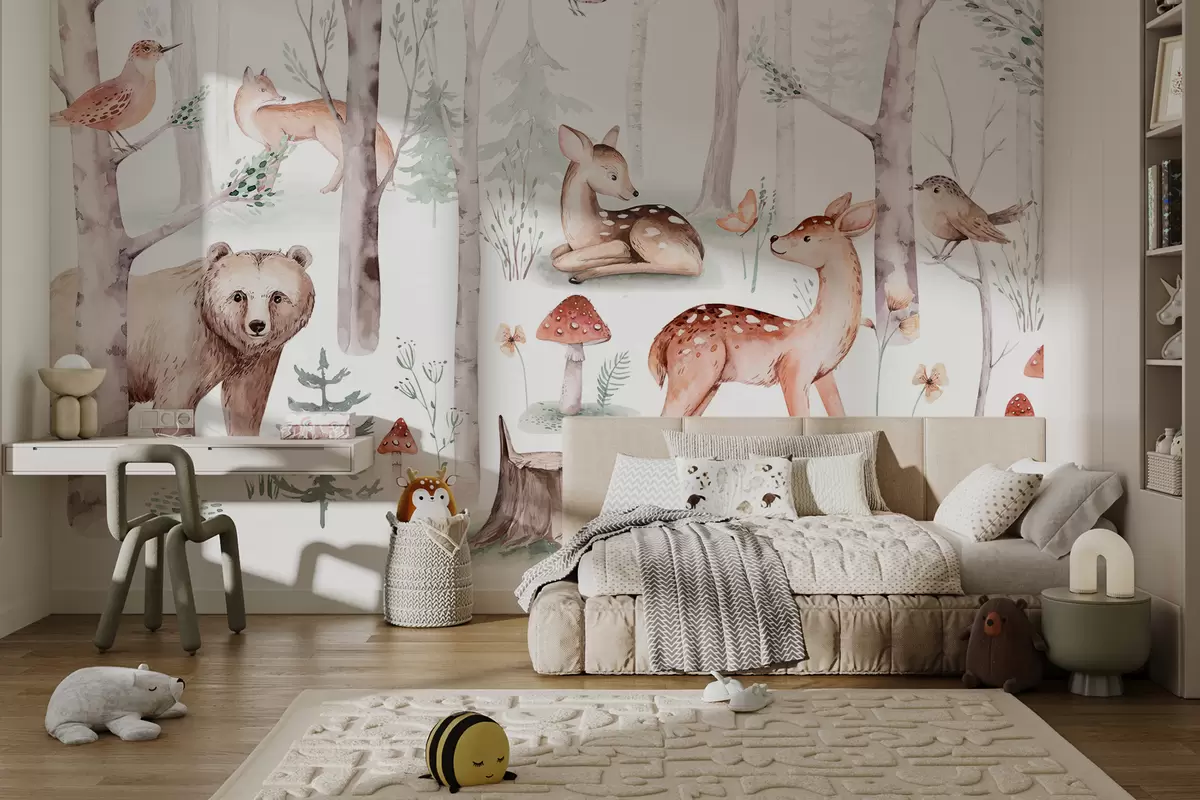 Fototapeter Tapet til barnerommet, skogsdyr. Delikat tapet i akvarellstil i behagelige varme pastellfarger på hvit bakgrunn Nr. w01089