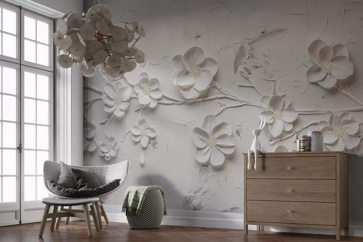 Fototapeter Hvit teksturert bakgrunn med hvite 3D-blomster i full blomst, forbundet med grener, minimalistisk og elegant Nr. w01226