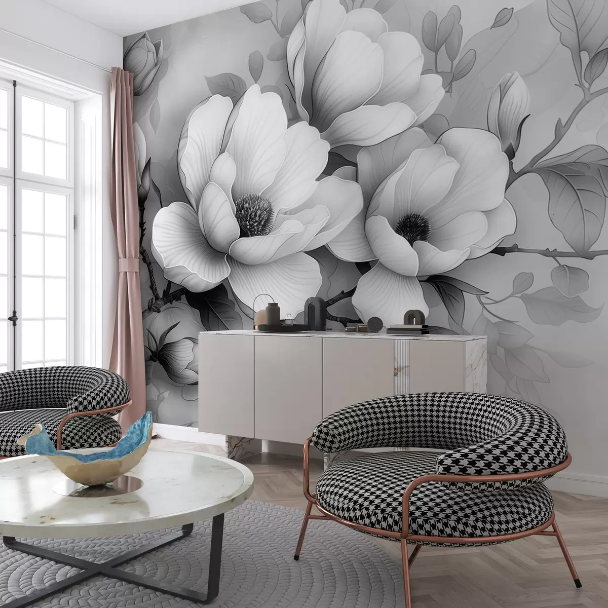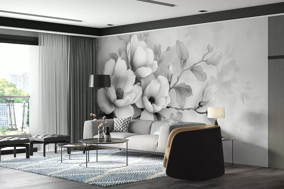 Fototapeter En svart-hvitt illustrasjon av en magnolia på en grå bakgrunn Nr. w01277