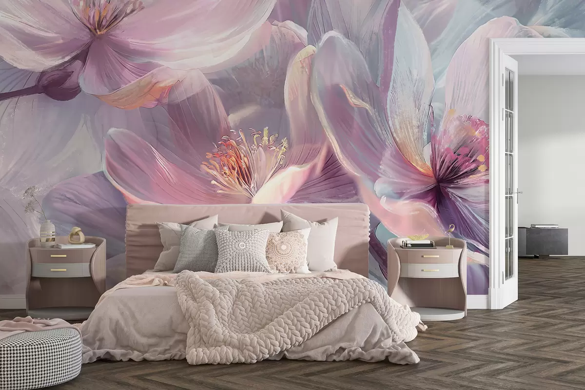 Fototapeter Delikat gjennomsiktig pastell neon lys rosa og hvite blomster med myk, uskarp bakgrunn Nr. w01307