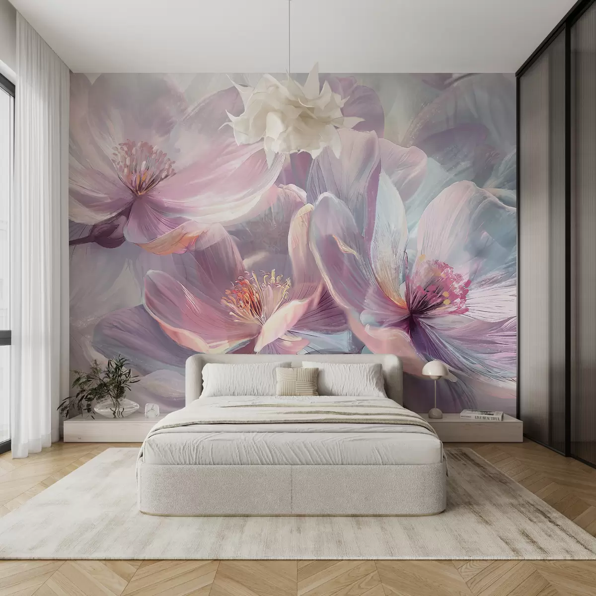 Fototapeter Delikat gjennomsiktig pastell neon lys rosa og hvite blomster med myk, uskarp bakgrunn Nr. w01307
