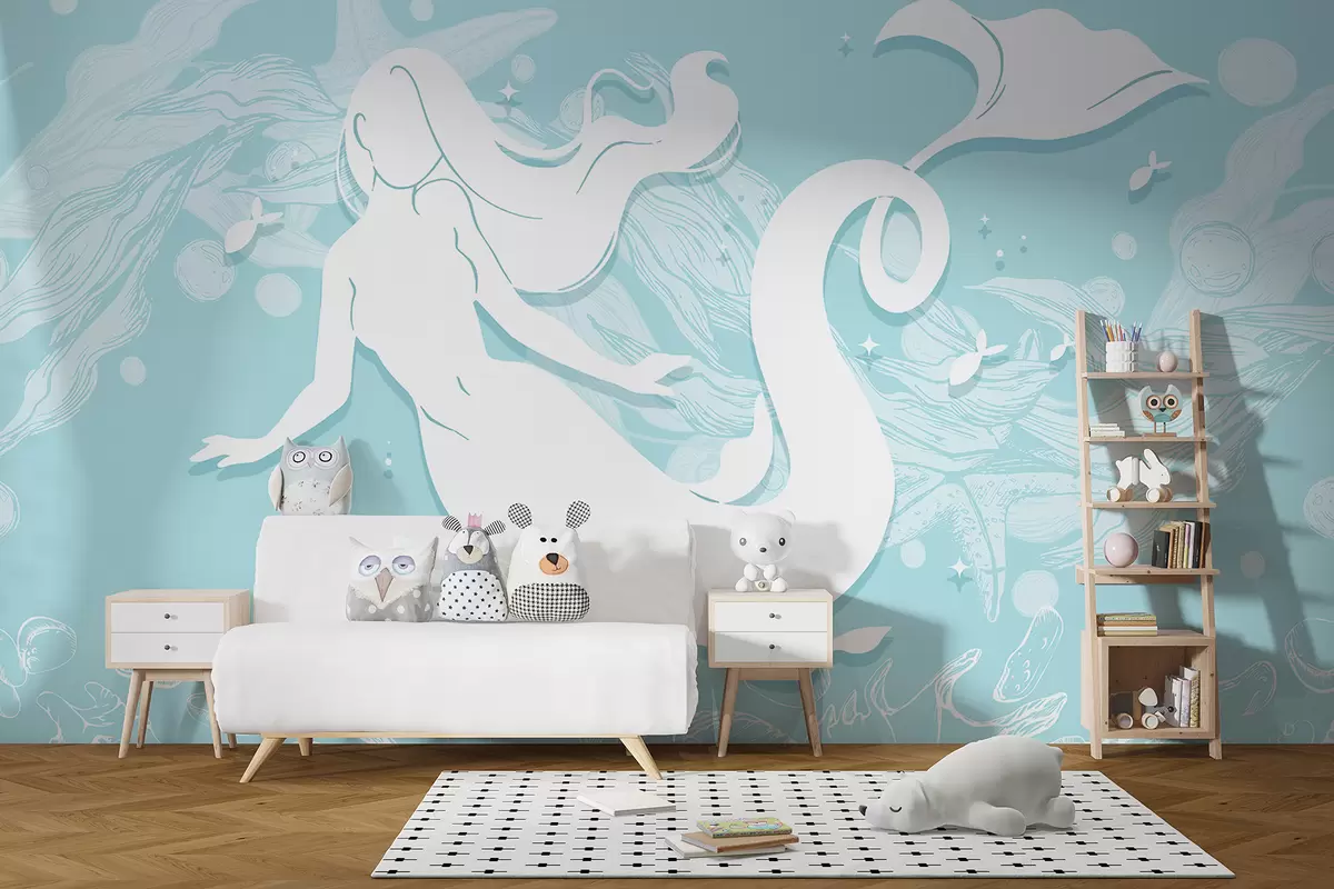 Fototapeter En hvit havfrue med langt flytende hår som svømmer i et lyseblått hav med hvite bølger og bobler Nr. w01316